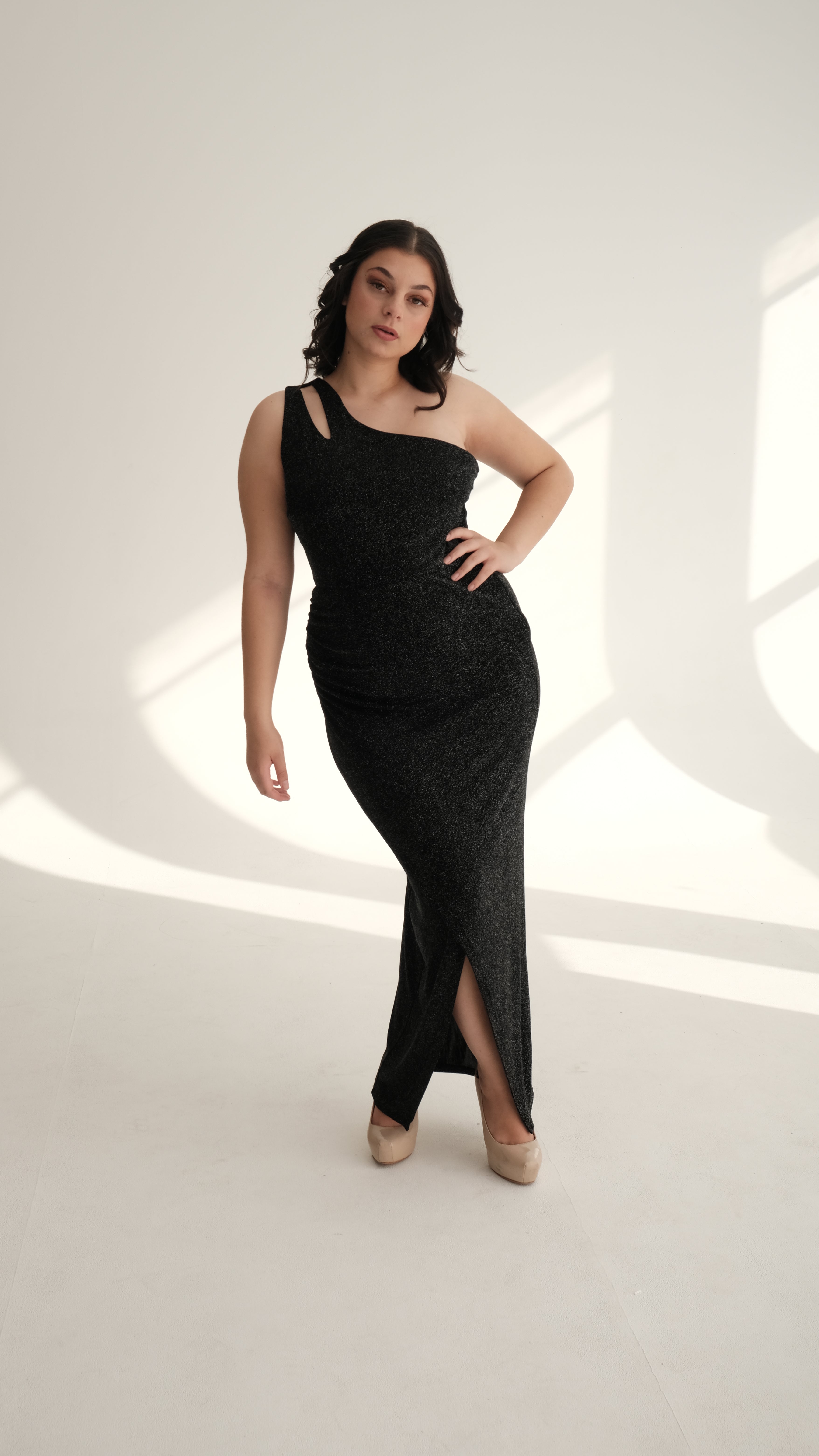 Sleek, sultry, and touched with a subtle sparkle — the Aurelia Noir was made for turning heads. Crafted in a stretch shimmer fabric, it hugs the figure while allowing for comfortable movement. The asymmetric one-shoulder neckline adds a modern twist, balanced by elegant ruching that flatters the waist and hips. A thigh-high front slit elongates the legs, while the floor-length hem brings drama to every step.