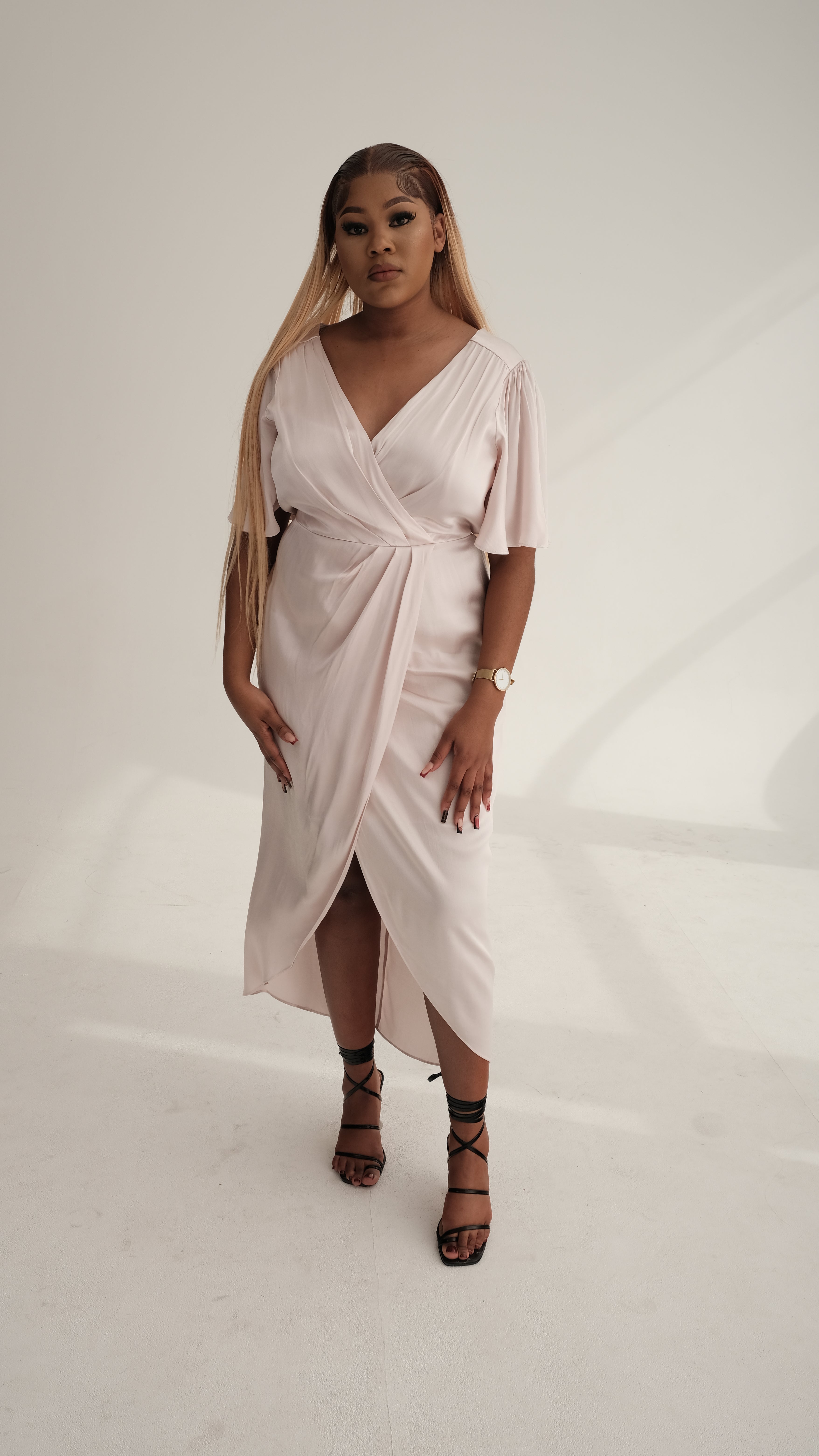 Effortlessly elegant, the Éloise Dress is a soft blush wrap-style midi that flatters every curve. Designed with a deep V-neckline, flutter sleeves, and a tie-back waist, it drapes beautifully to create a feminine silhouette. Perfect for weddings, special occasions, or an elevated evening out, this dress combines comfort with timeless sophistication.