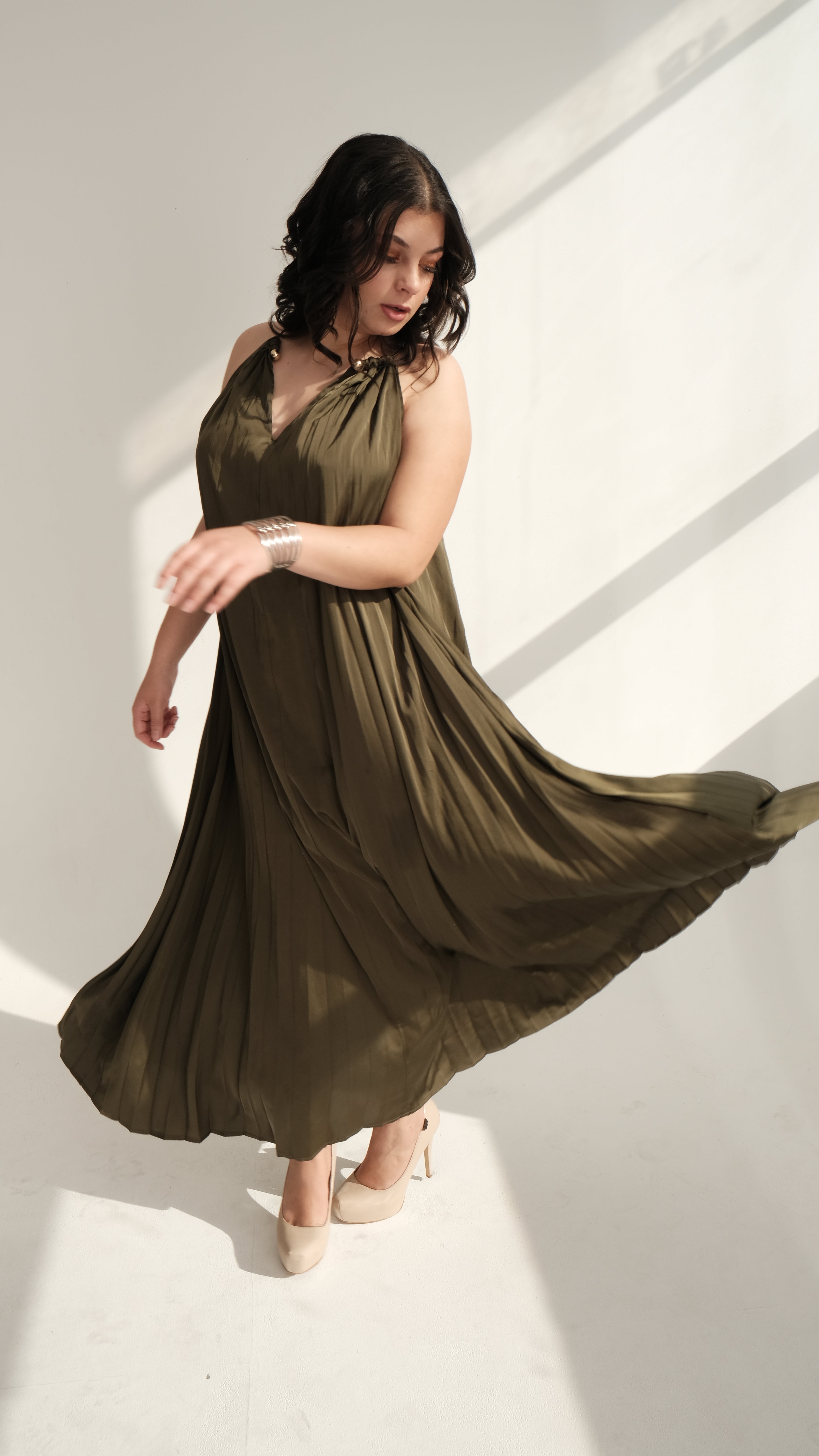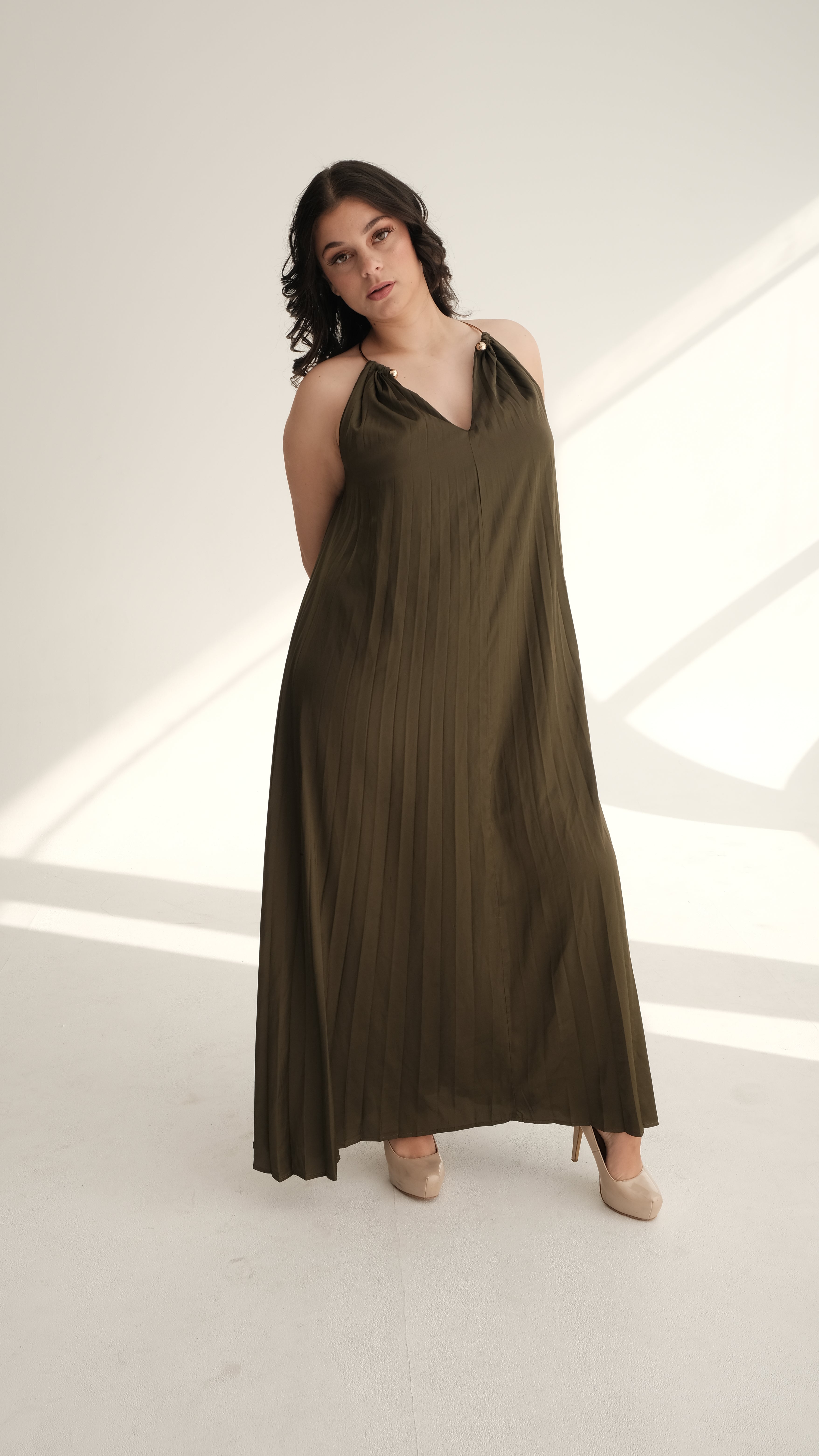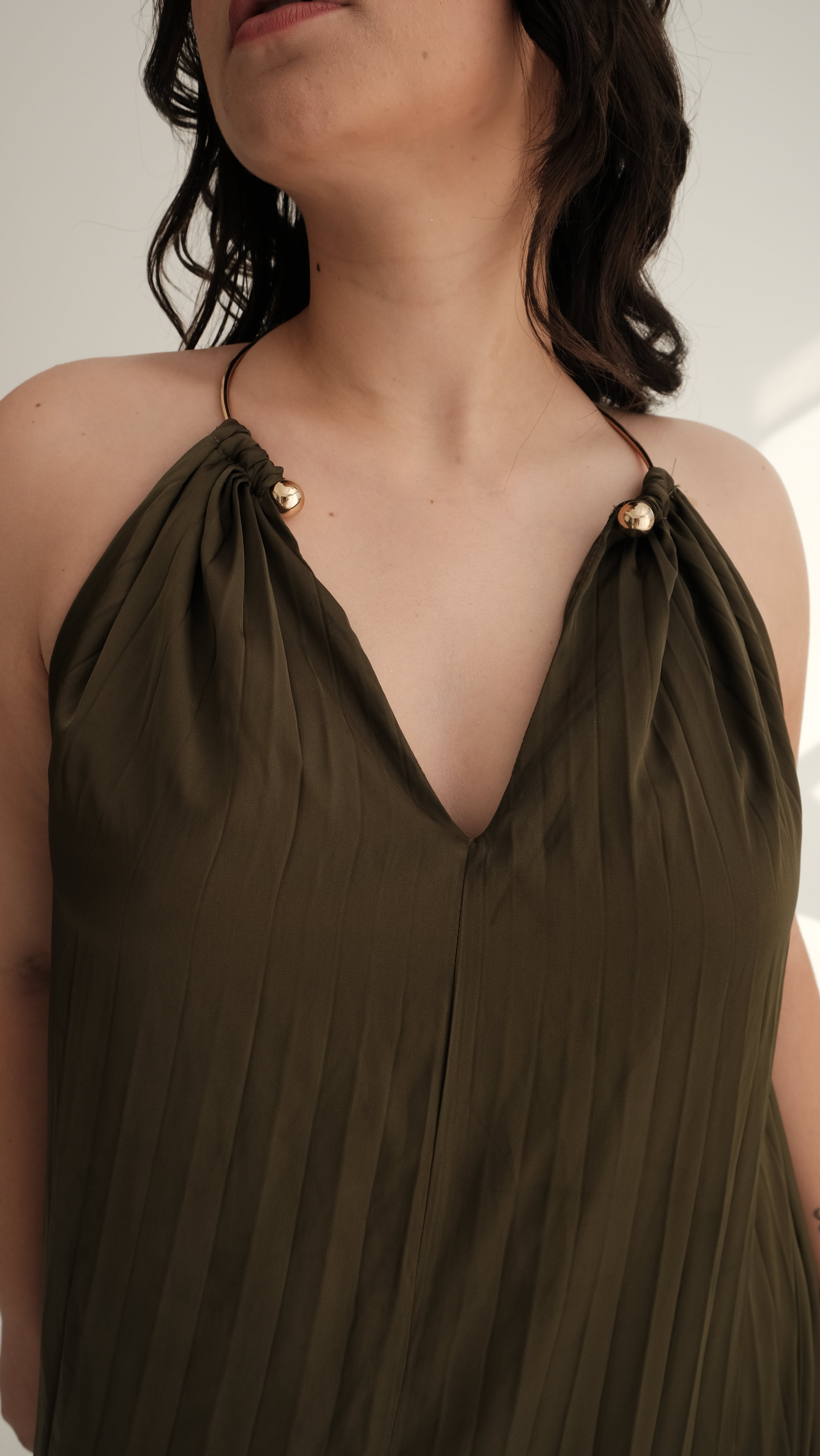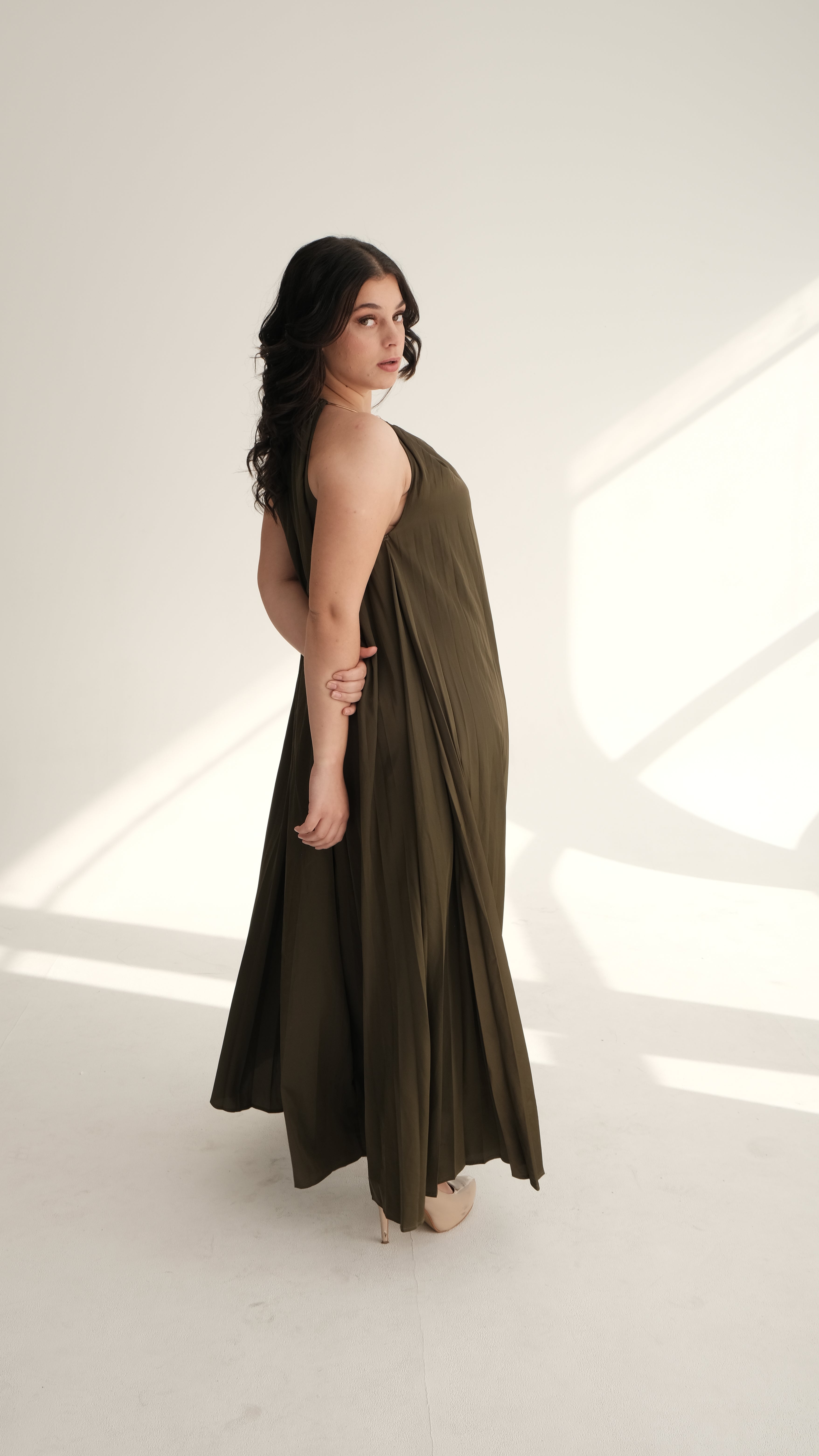 Flowing, feminine, and effortlessly striking, The Amahle is a masterclass in understated elegance. Crafted in a soft, lightweight fabric with a gentle pleat texture, this olive-toned maxi moves beautifully with every step. The gathered halter neckline is finished with gleaming gold hardware, drawing the eye to the shoulders and adding a subtle hint of glamour. A relaxed fit and draped skirt create a breezy silhouette that’s as comfortable as it is captivating.