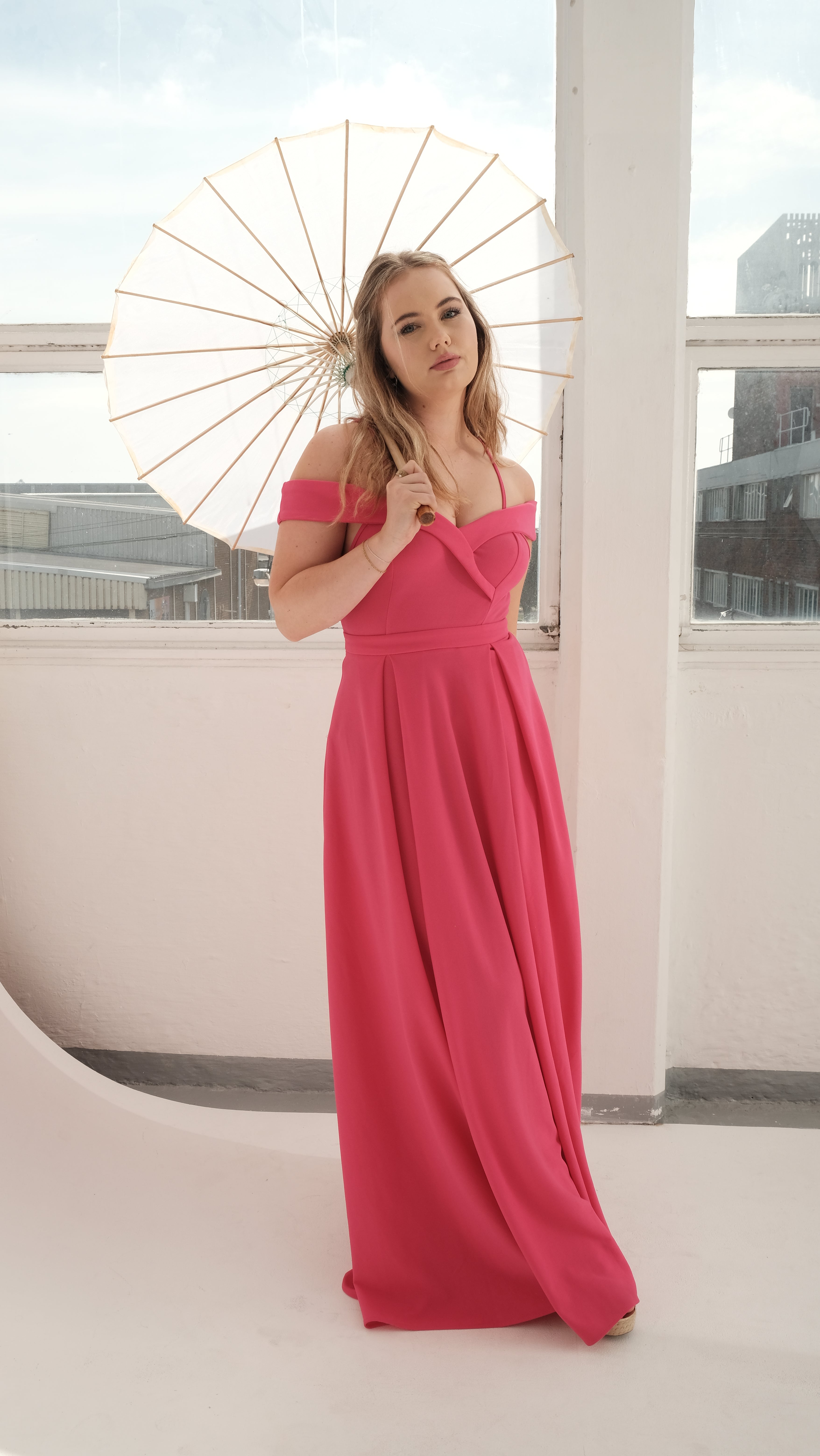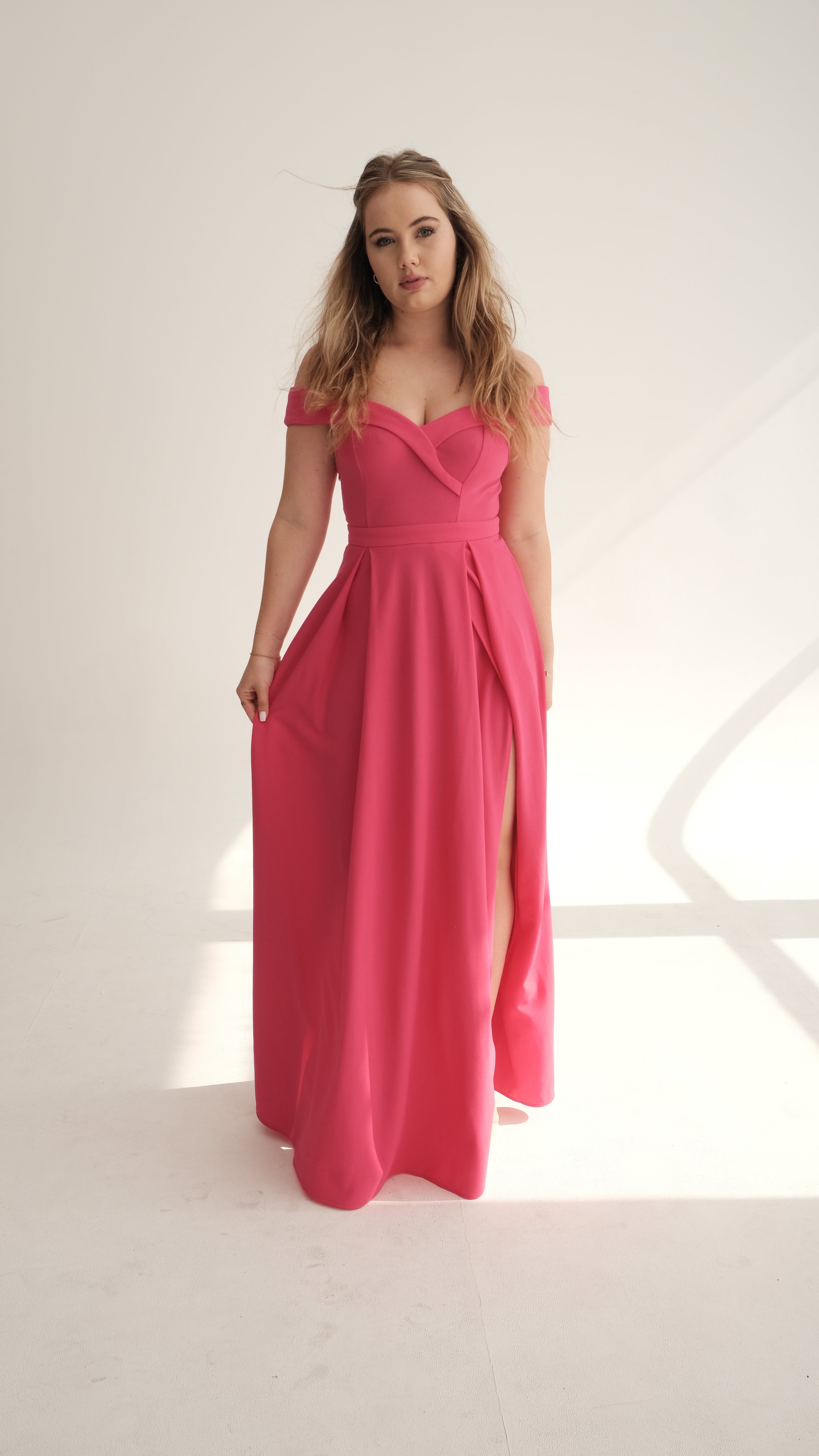 Make a statement in the Celestia Gown – a bold, vibrant piece in a stunning hot pink hue. Designed with a romantic off-the-shoulder neckline, a fitted bodice, and a flowing A-line skirt, this gown brings both drama and elegance. The thigh-high slit adds just the right amount of allure, perfect for making an entrance at any special occasion.