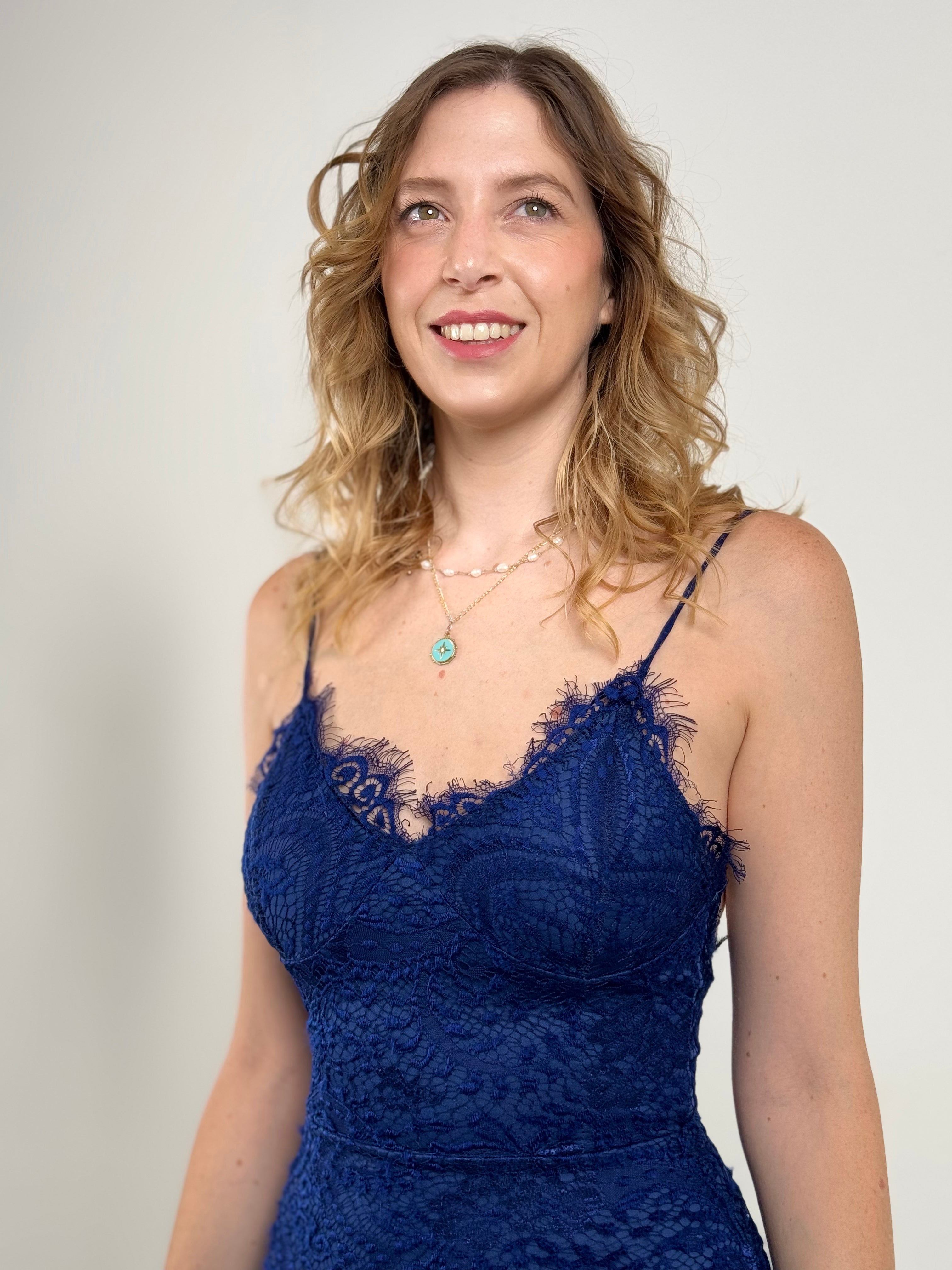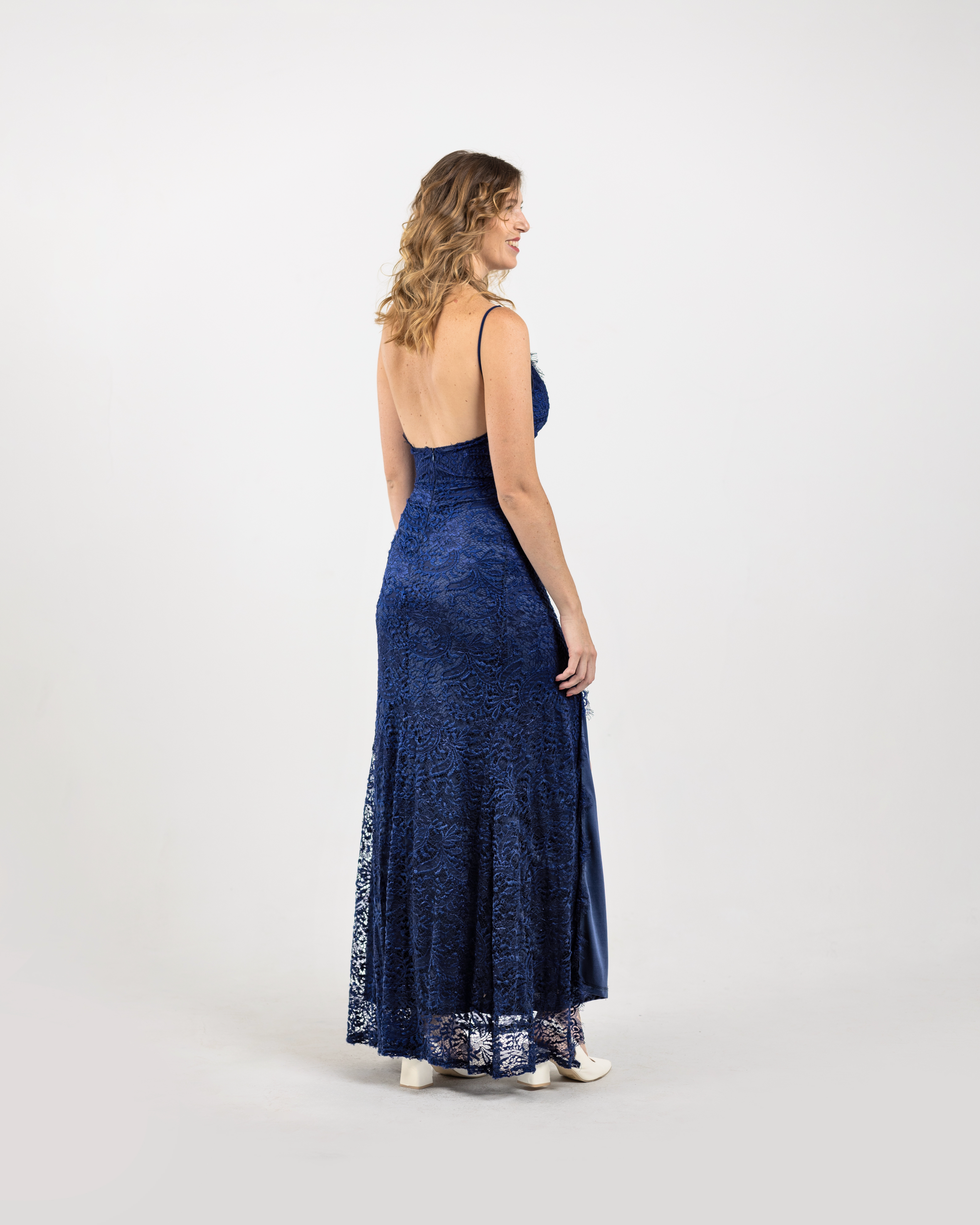 The Elodie is where timeless romance meets red-carpet allure. Cut from intricate navy lace layered over a silky lining, this gown hugs the figure before flowing into a graceful hem. The delicate eyelash-lace neckline and barely-there straps frame the décolletage, while the daring open back adds a sultry contrast. A thigh-high slit brings just the right amount of drama for your evening entrance.