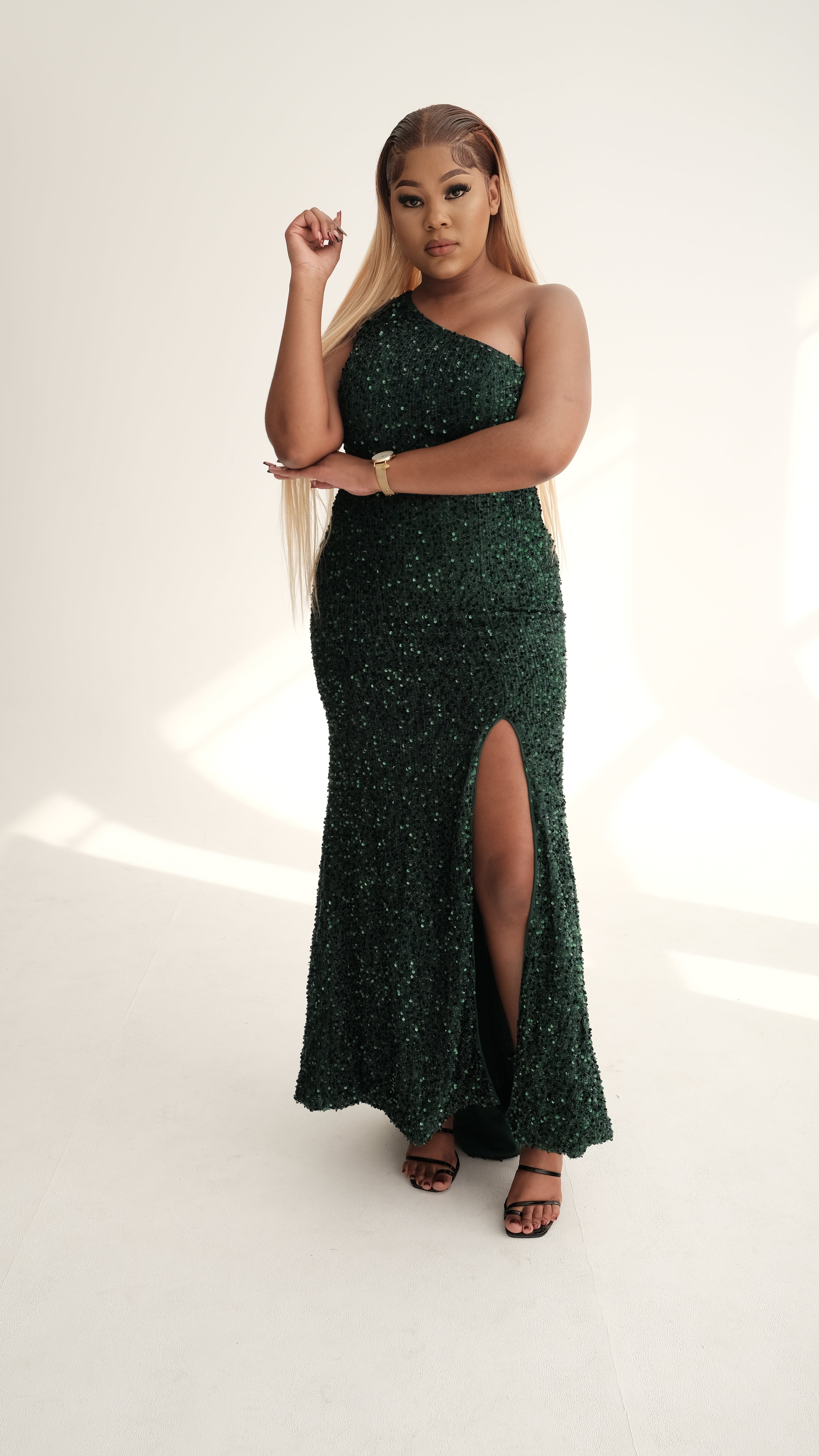Turn heads in The Emerald Siren, a captivating one-shoulder gown designed for those who demand glamour with an edge. Drenched in deep emerald sequins that shimmer with every step, this figure-hugging silhouette is elevated by a daring thigh-high slit and an asymmetrical neckline. The back features a unique double-strap detail for a striking finish. Perfect for formal evenings, black-tie events, or when you simply want to steal the spotlight.