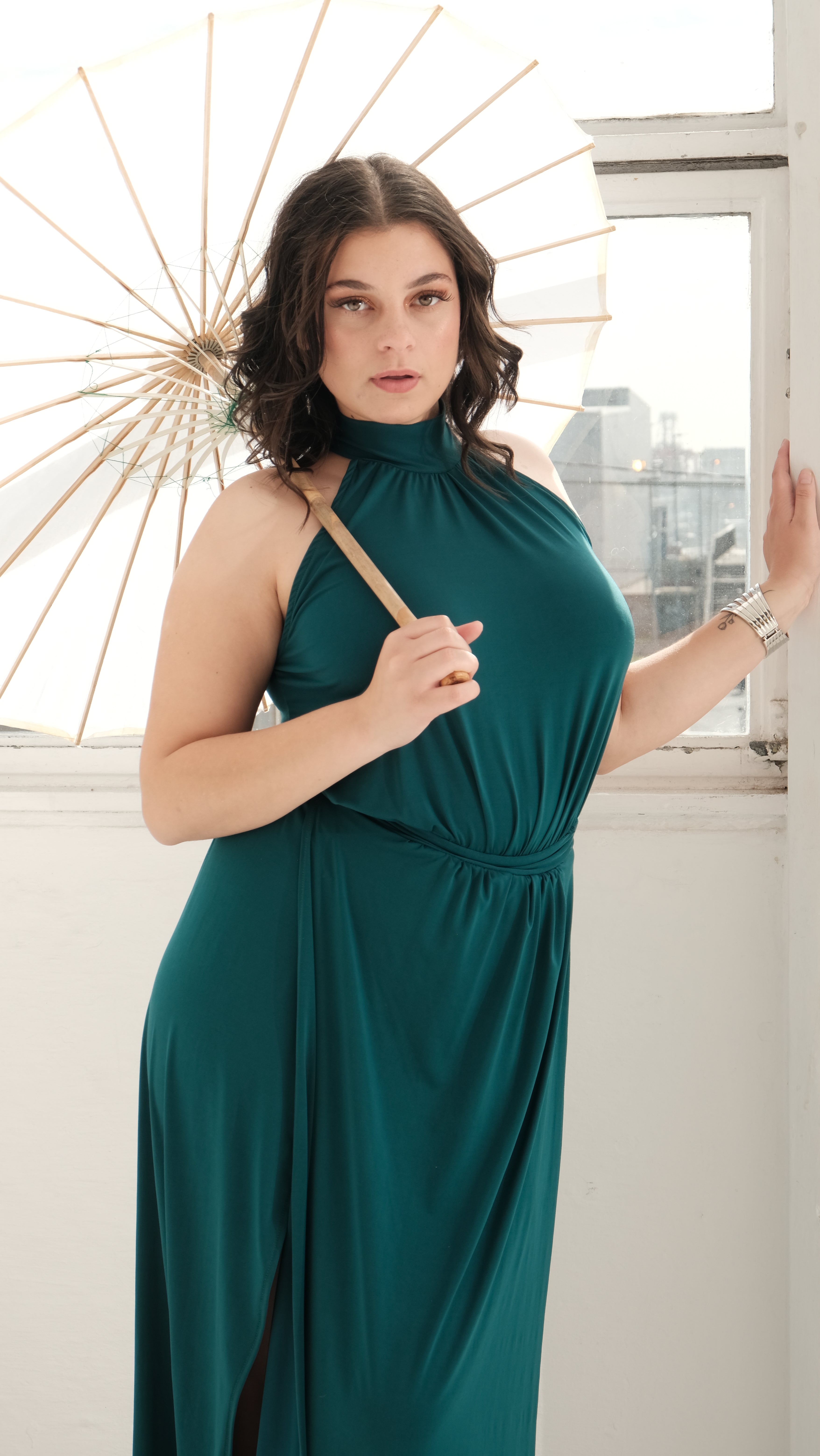 The Isla captures modern sophistication with its sleek high-neck design and daring thigh-high slit. Crafted in a rich emerald green, this gown drapes effortlessly over the figure, while the open-back detail with delicate button fastening adds a touch of allure. Perfect for evening soirées, weddings, or any occasion where understated elegance is key.