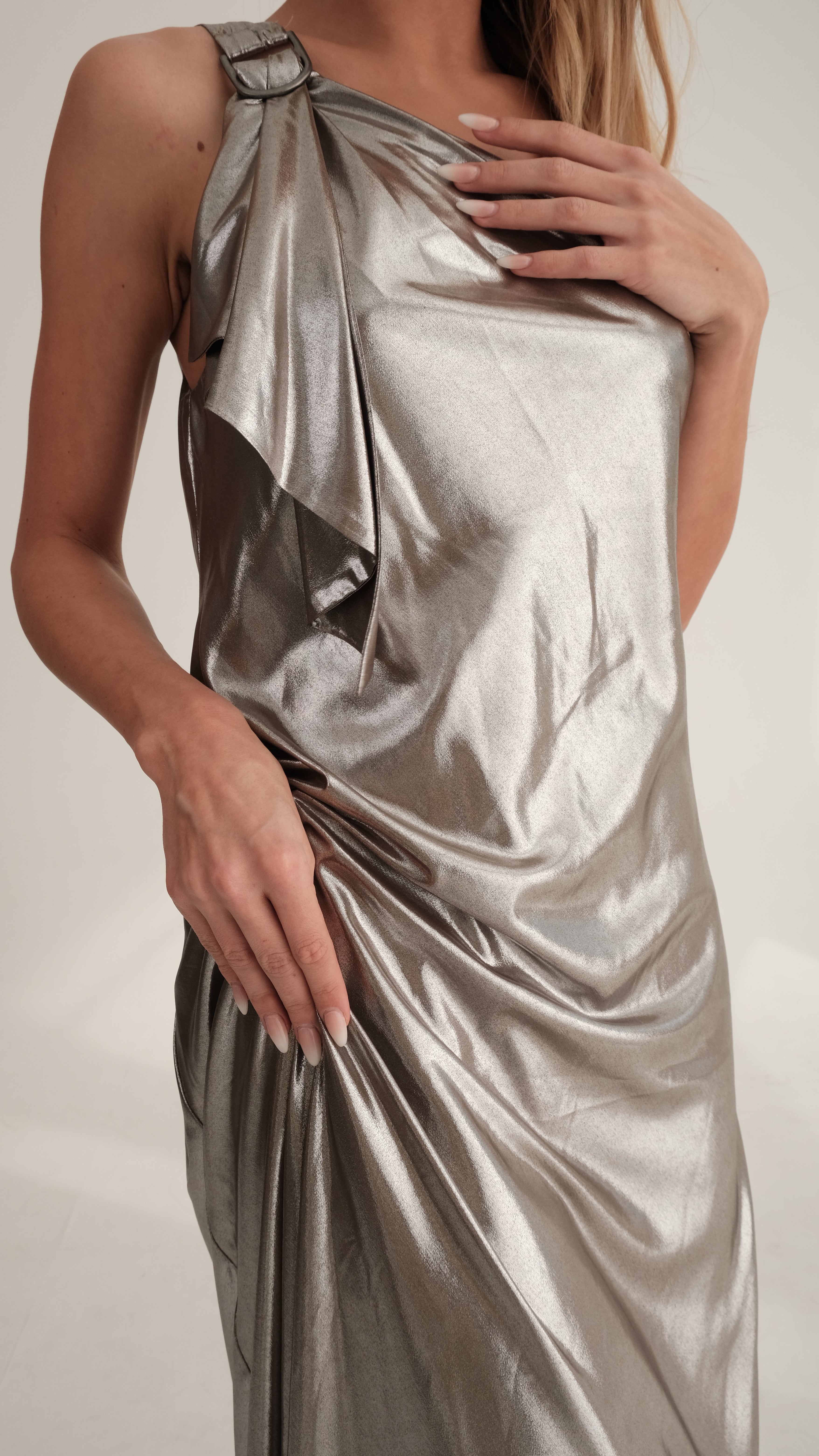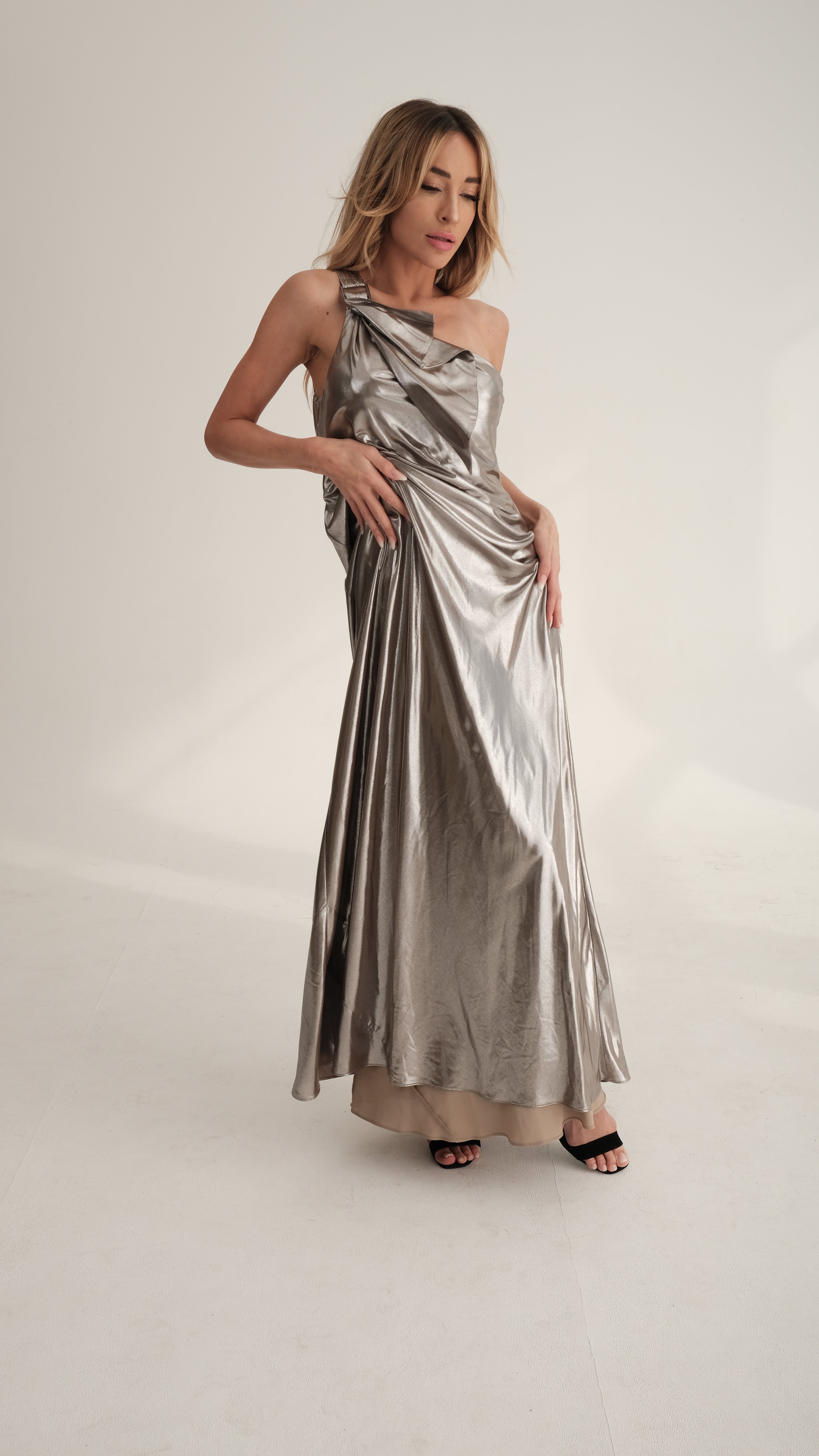 Step into the spotlight with The Mercury, a breathtaking Ralph Lauren creation that redefines modern glamour. Crafted in a liquid silver metallic fabric, this one-shoulder gown drapes effortlessly over the body, creating a statuesque silhouette that exudes confidence and elegance. The statement shoulder detail, featuring a soft fold and silver D-ring accent, adds architectural interest, while the fluid finish catches the light with every movement. Perfect for black-tie events, evening galas, or any occasion where making an unforgettable entrance is non-negotiable.