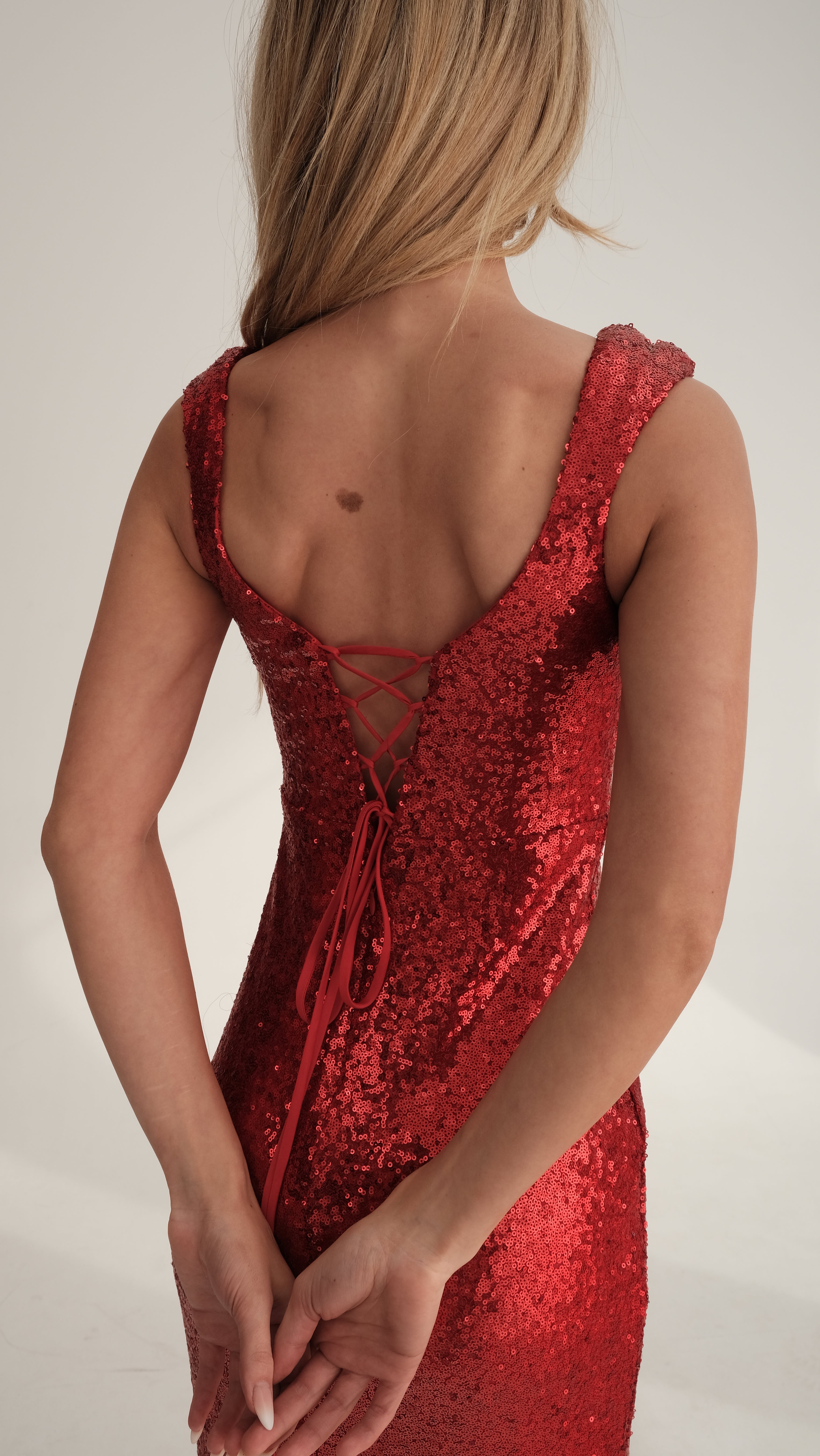 Turn heads in The Scarlett, a show-stopping gown drenched in dazzling red sequins. The figure-hugging silhouette is perfectly balanced with a sultry thigh-high slit and a delicate lace-up back, ensuring a custom fit that flatters from every angle. Featuring a classic V-neckline and sleeveless design, this gown is made for unforgettable entrances—whether at a gala, prom, or high-profile soirée.