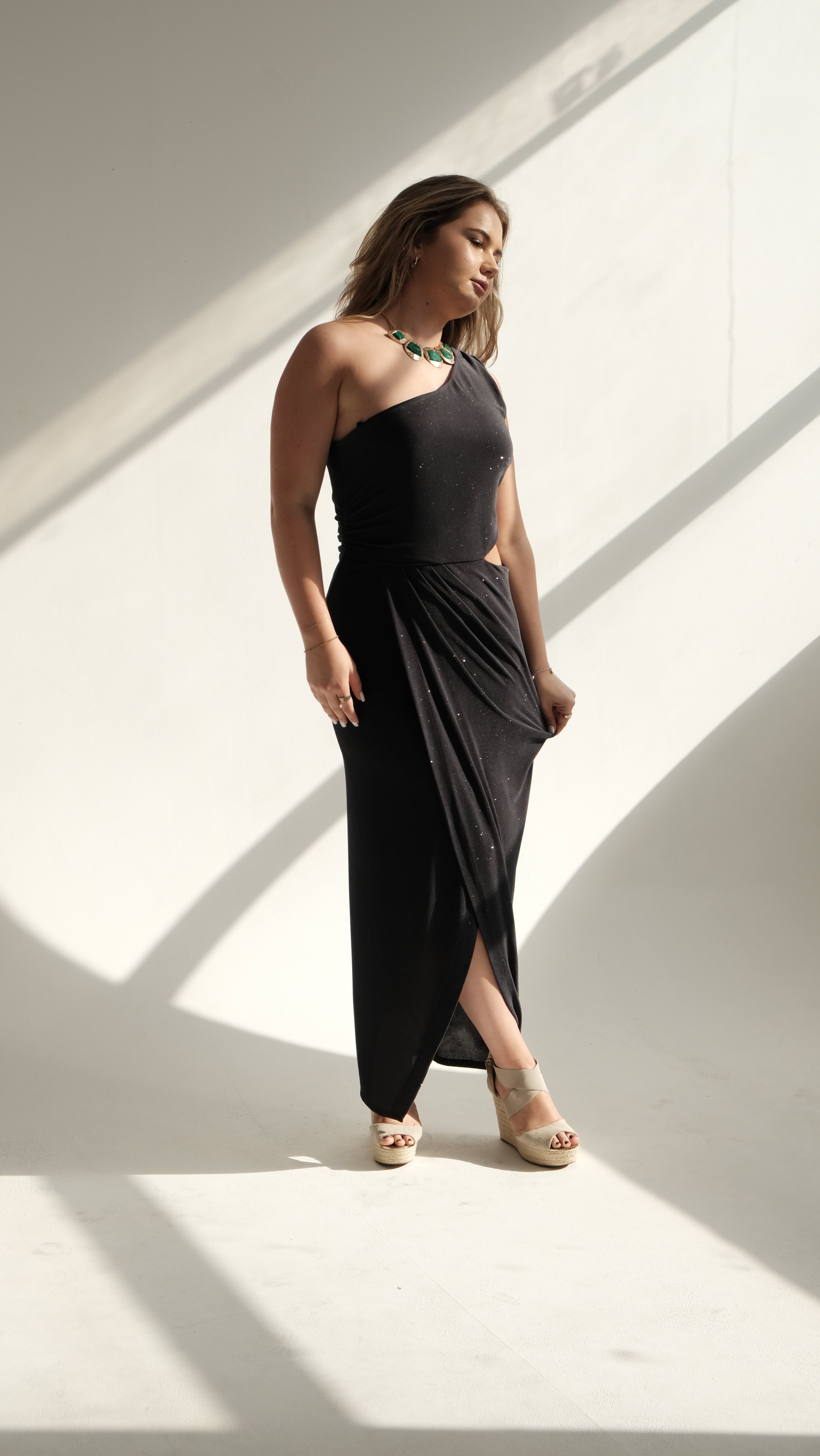 Turn heads in The Selene, a daring yet timeless black one-shoulder evening gown designed for the woman who commands attention. Crafted from a sleek, stretch fabric that hugs your curves, this floor-length formal dress features an elegant asymmetrical neckline, an alluring side cut-out, and a dramatic thigh-high slit for just the right amount of allure. The figure-enhancing silhouette moves effortlessly with you, making it perfect for cocktail parties, matric dances, gala dinners, or any event where you want to make an unforgettable entrance.