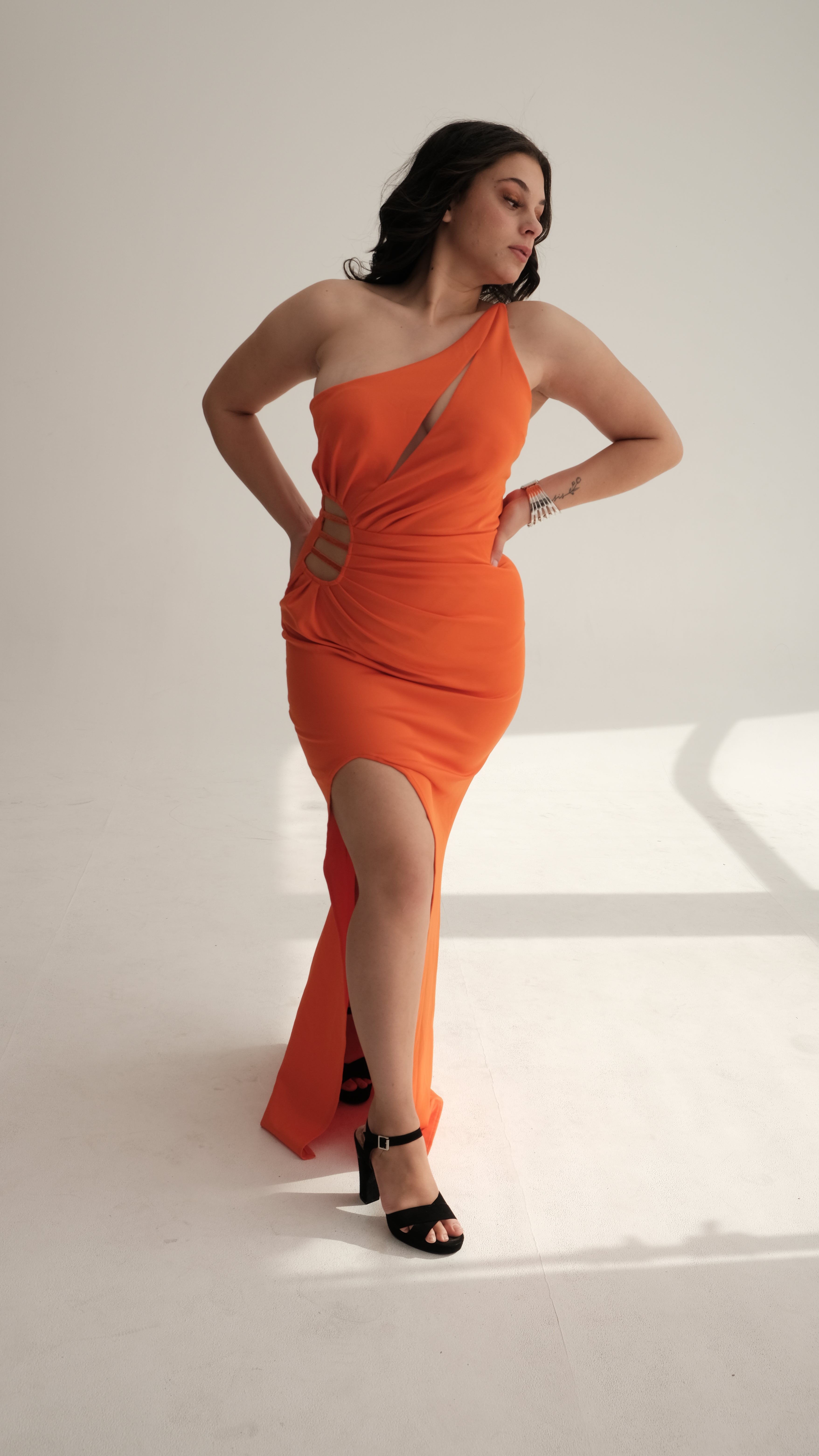 Turn heads in The Solara, a bold one-shoulder orange evening gown designed for women who aren’t afraid to stand out. This figure-hugging formal dress features daring side cut-outs with glittering strap detailing, a thigh-high slit for a sultry touch, and a sleek floor-length silhouette that enhances your curves. Perfect for matric dances, weddings, red-carpet events, and glamorous nights out, The Solara radiates confidence and allure.