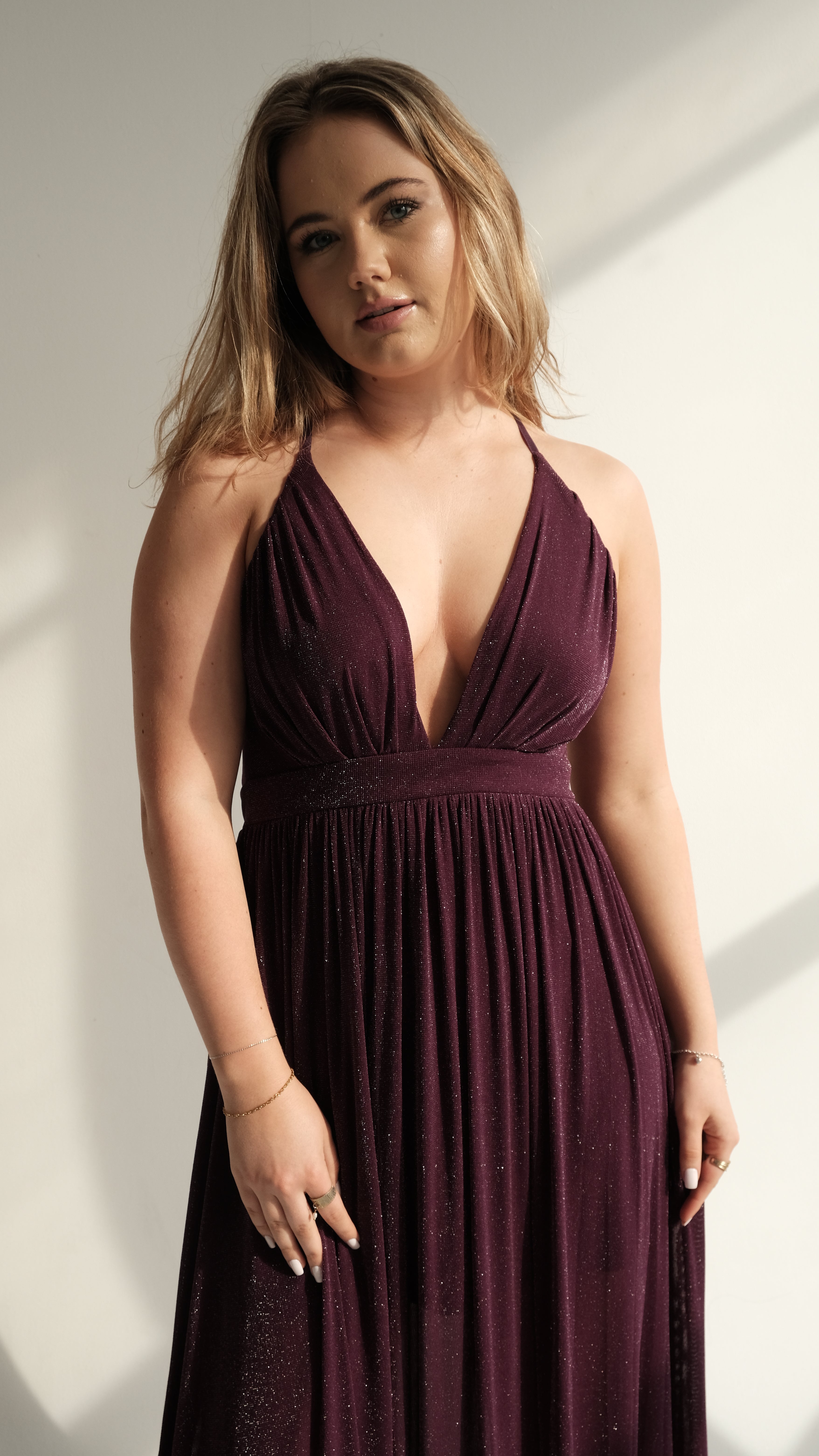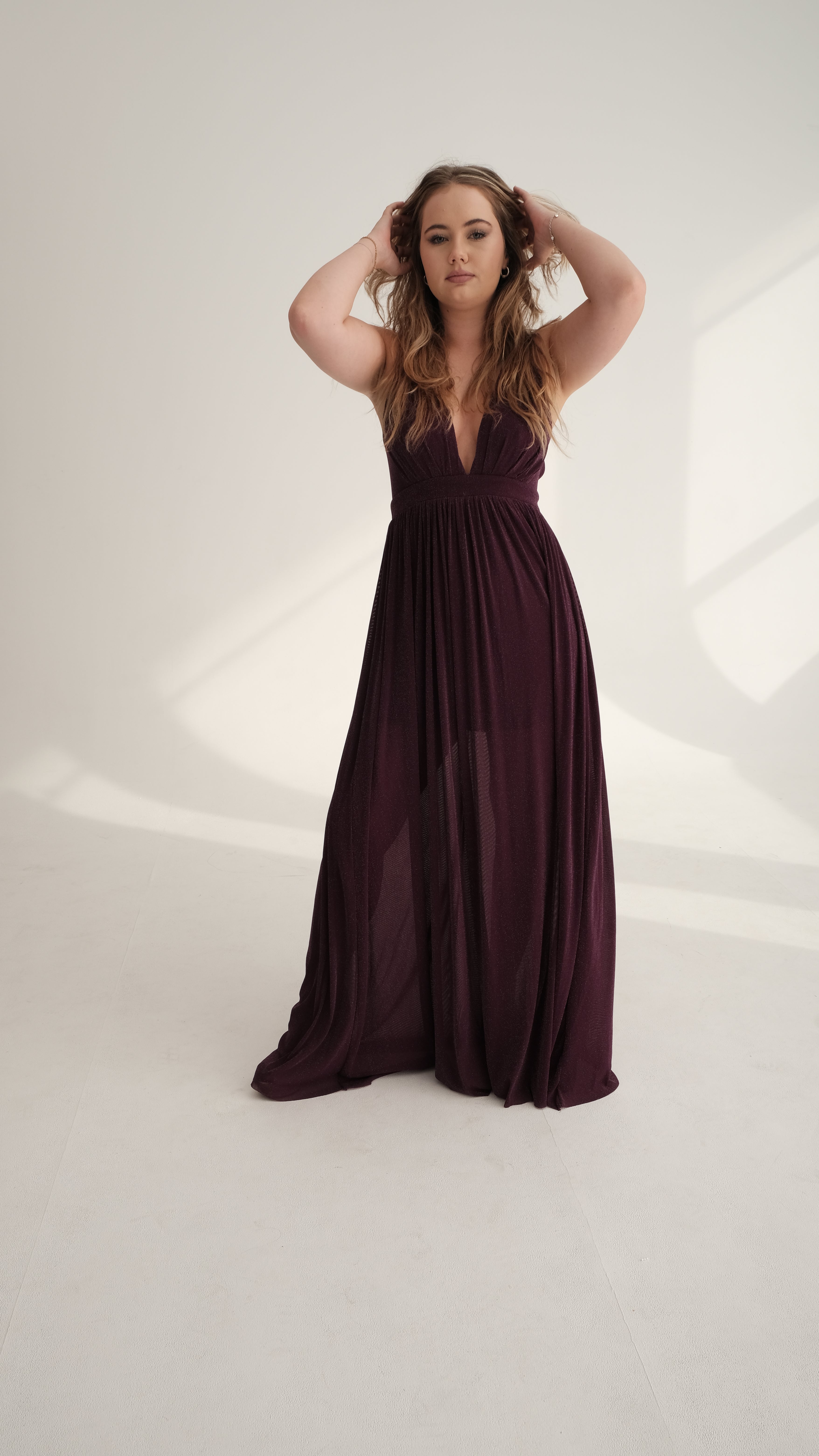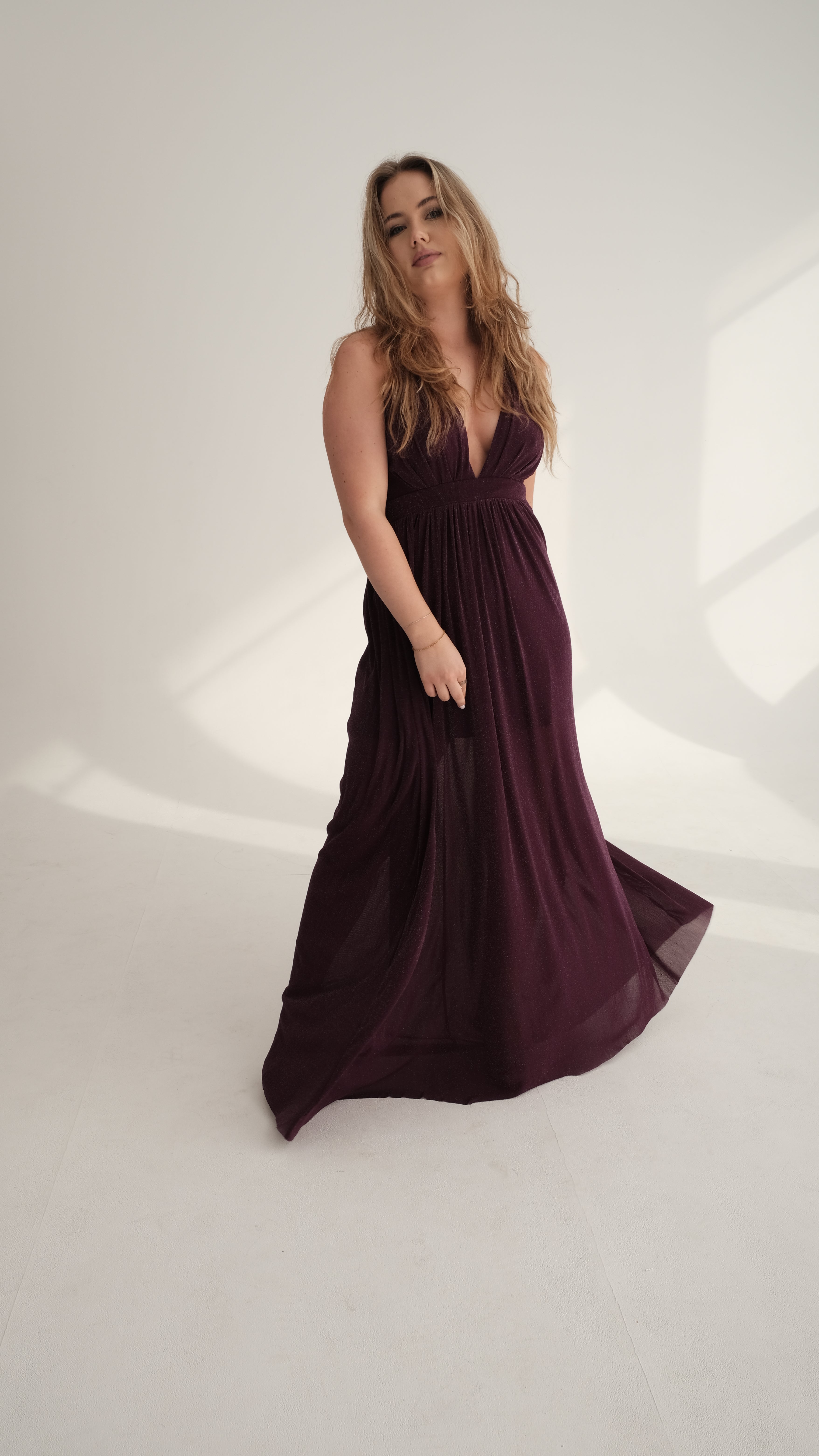 Effortless elegance meets timeless charm in The Soraya. Crafted from a rich, deep plum fabric with a subtle shimmer, this gown is designed to drape beautifully over the body, creating a flattering silhouette for every figure. The plunging V-neckline and empire waistline elongate the frame, while the flowing skirt moves gracefully with every step.