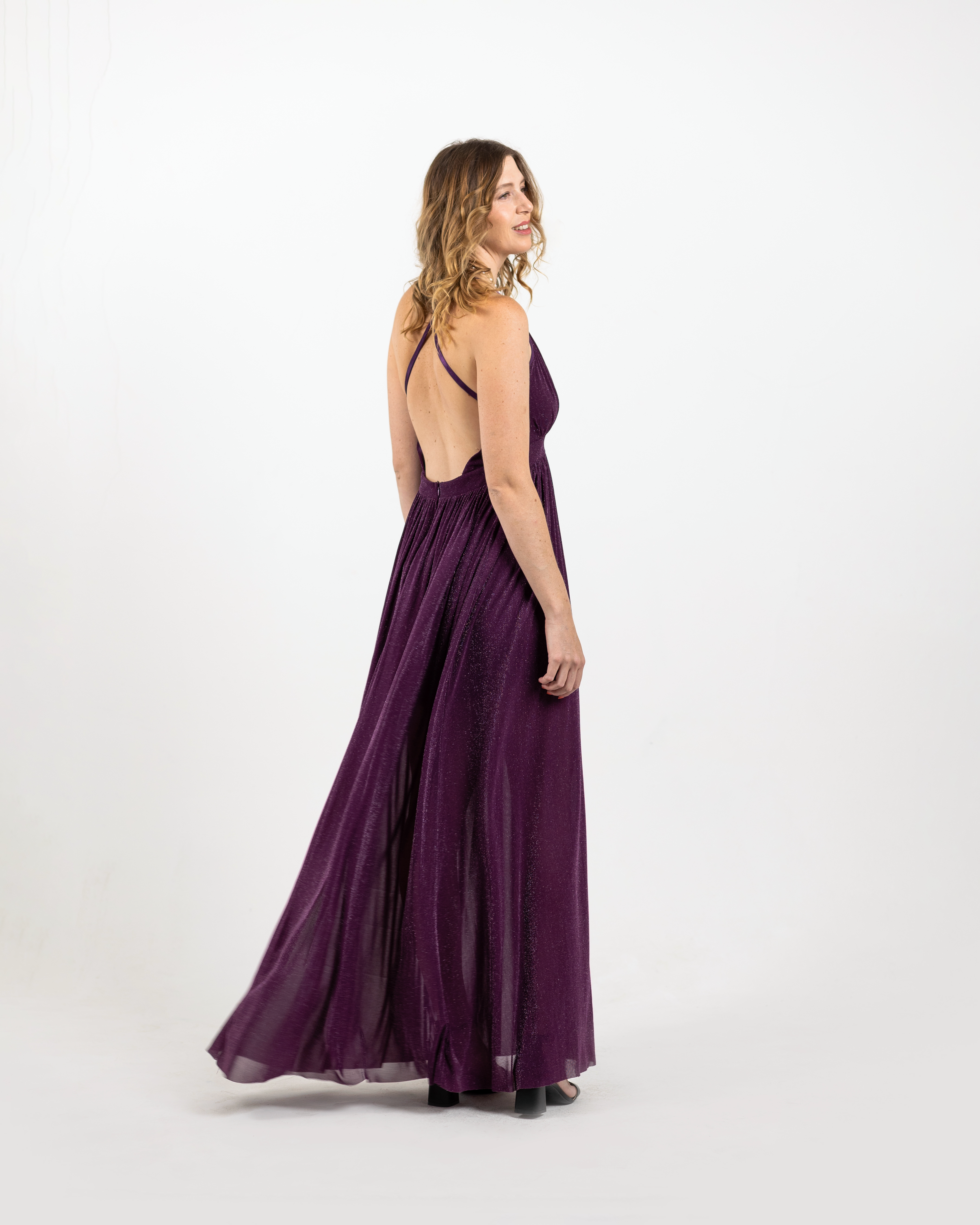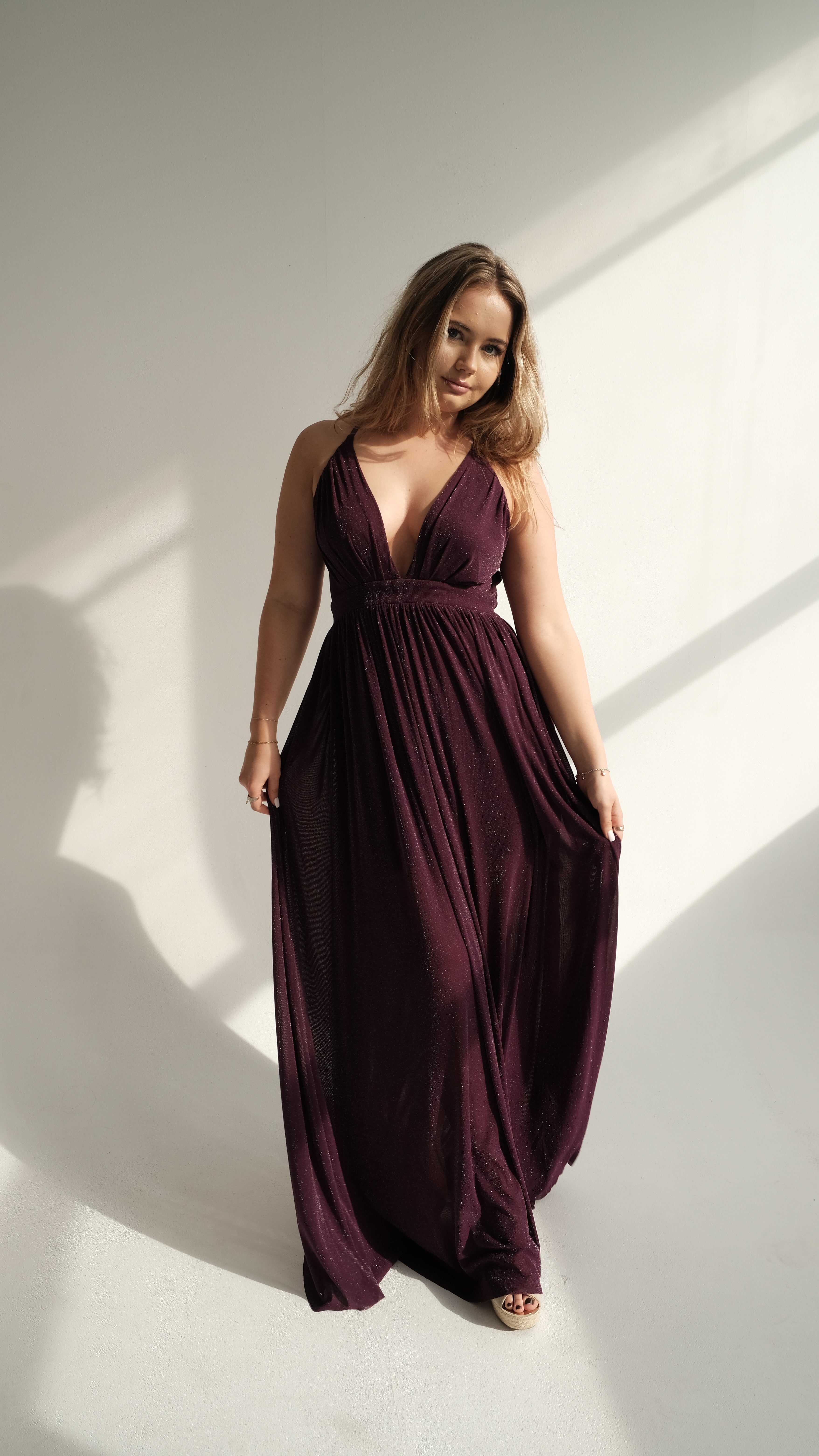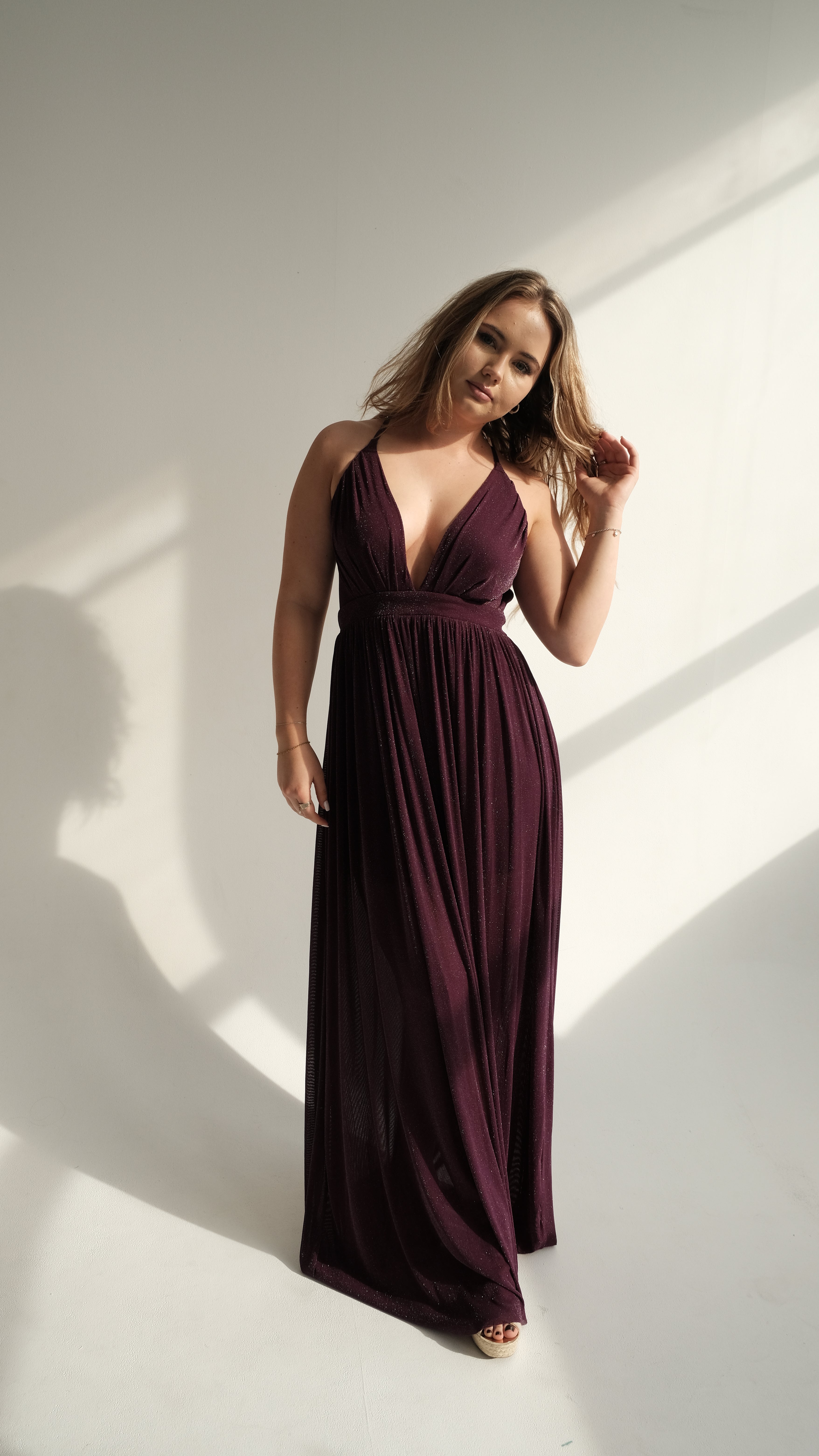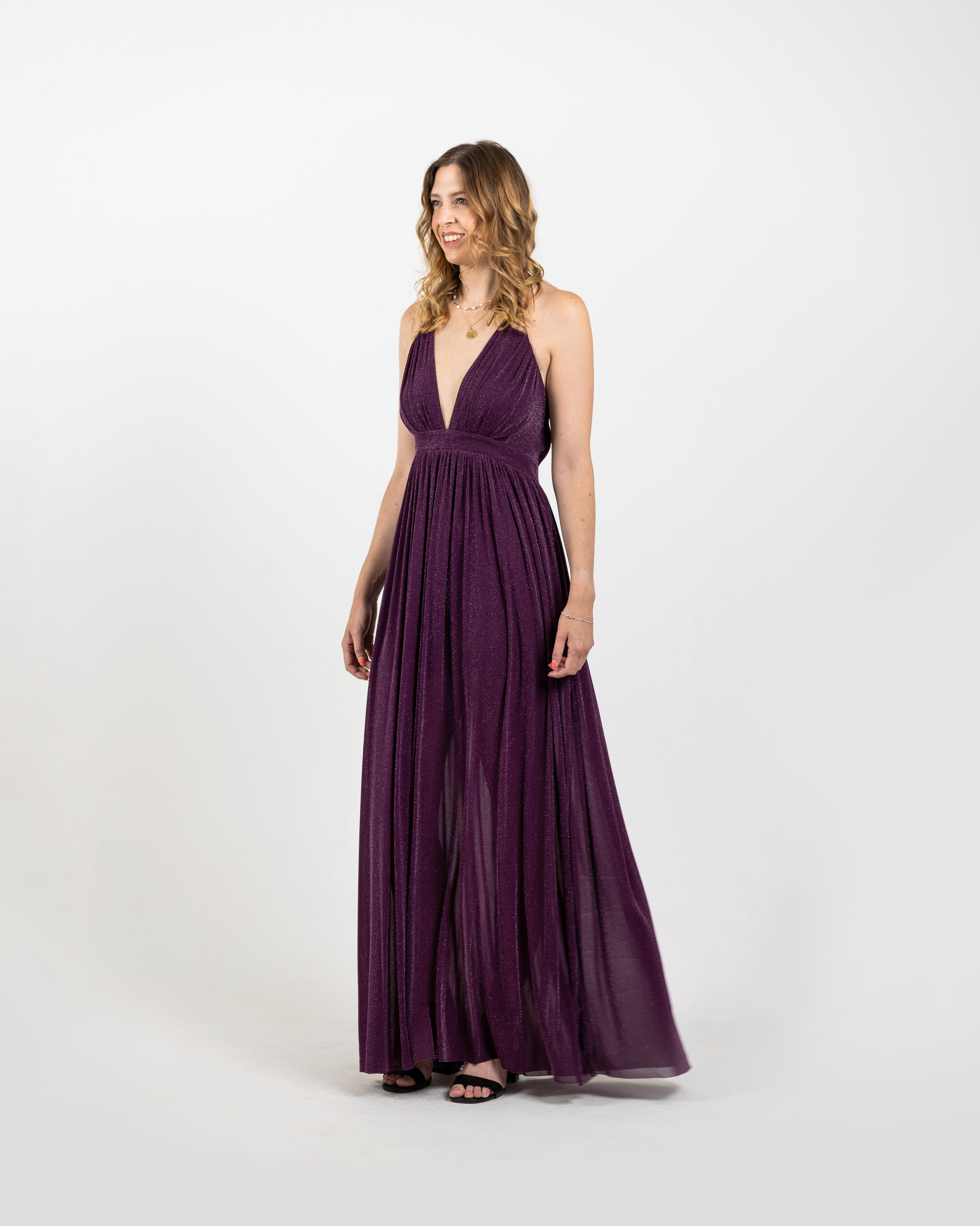 Effortless elegance meets timeless charm in The Soraya. Crafted from a rich, deep plum fabric with a subtle shimmer, this gown is designed to drape beautifully over the body, creating a flattering silhouette for every figure. The plunging V-neckline and empire waistline elongate the frame, while the flowing skirt moves gracefully with every step.