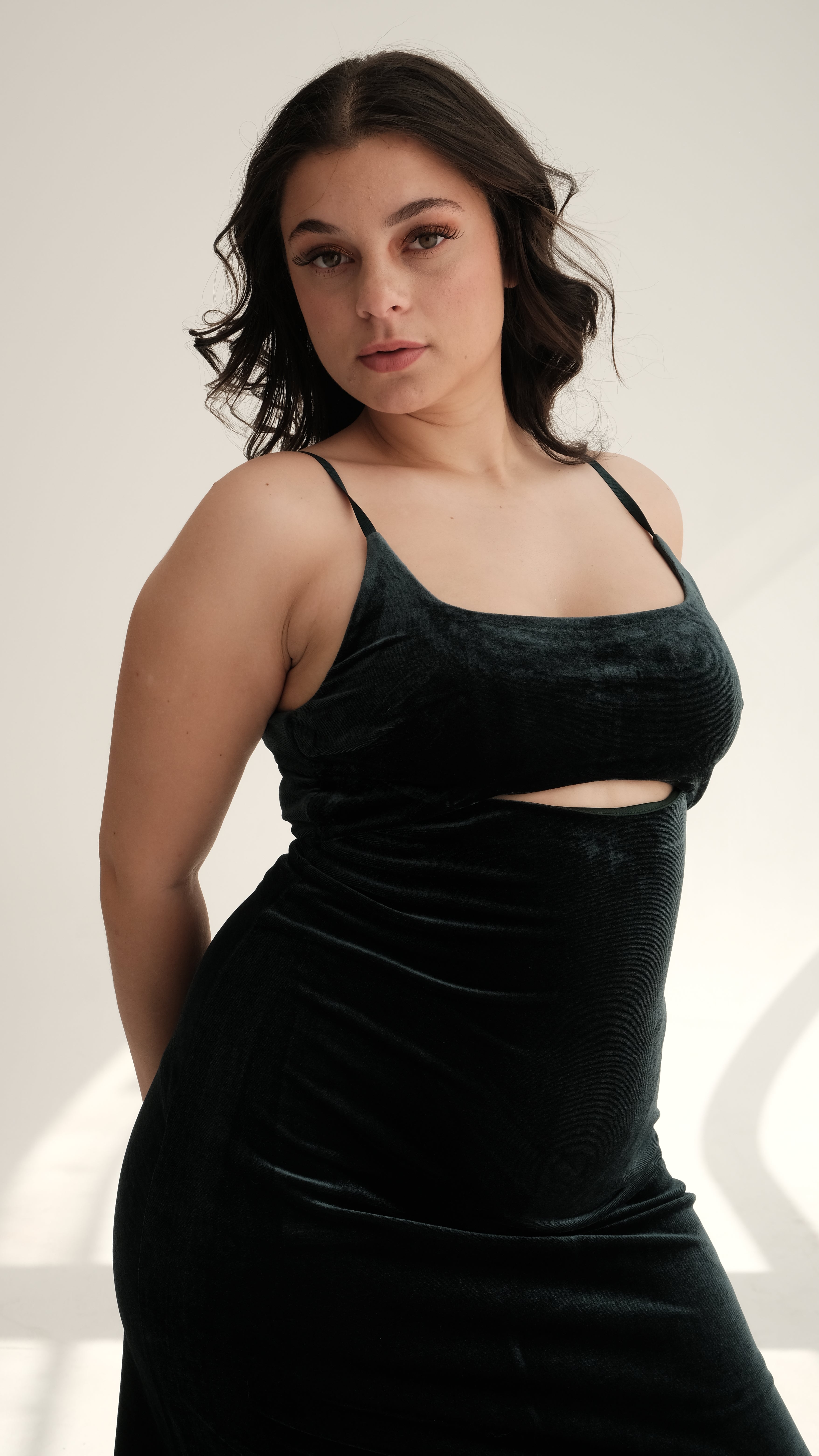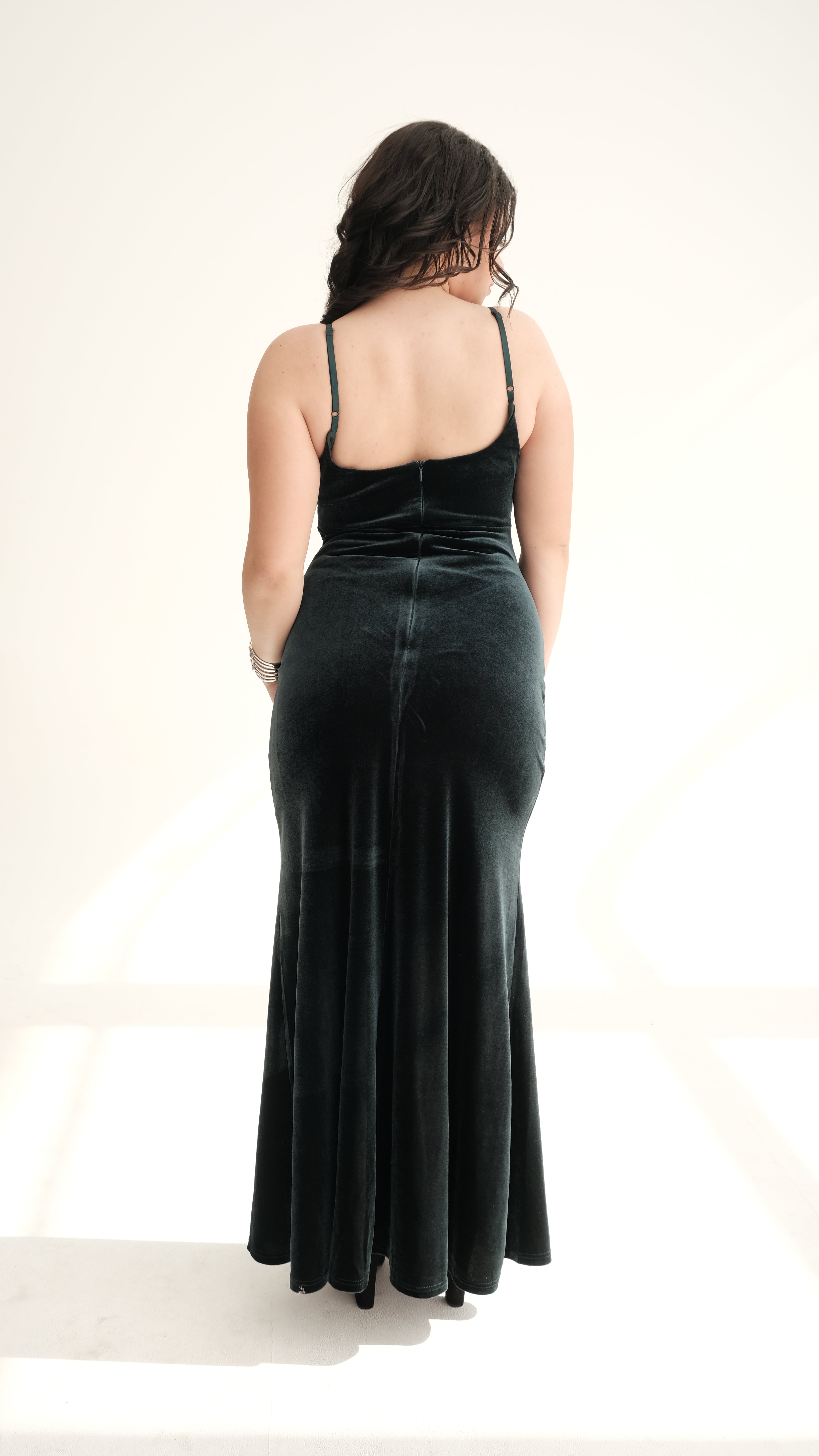 Drape yourself in luxury with the Valentina Velvet Gown — a statement piece that blends timeless elegance with modern allure. Crafted in sumptuous deep emerald velvet, this form-fitting dress skims your curves before falling into a graceful mermaid hemline. The delicate spaghetti straps and subtle side cut-out add a daring twist, while the open back ensures a sophisticated, show-stopping finish.