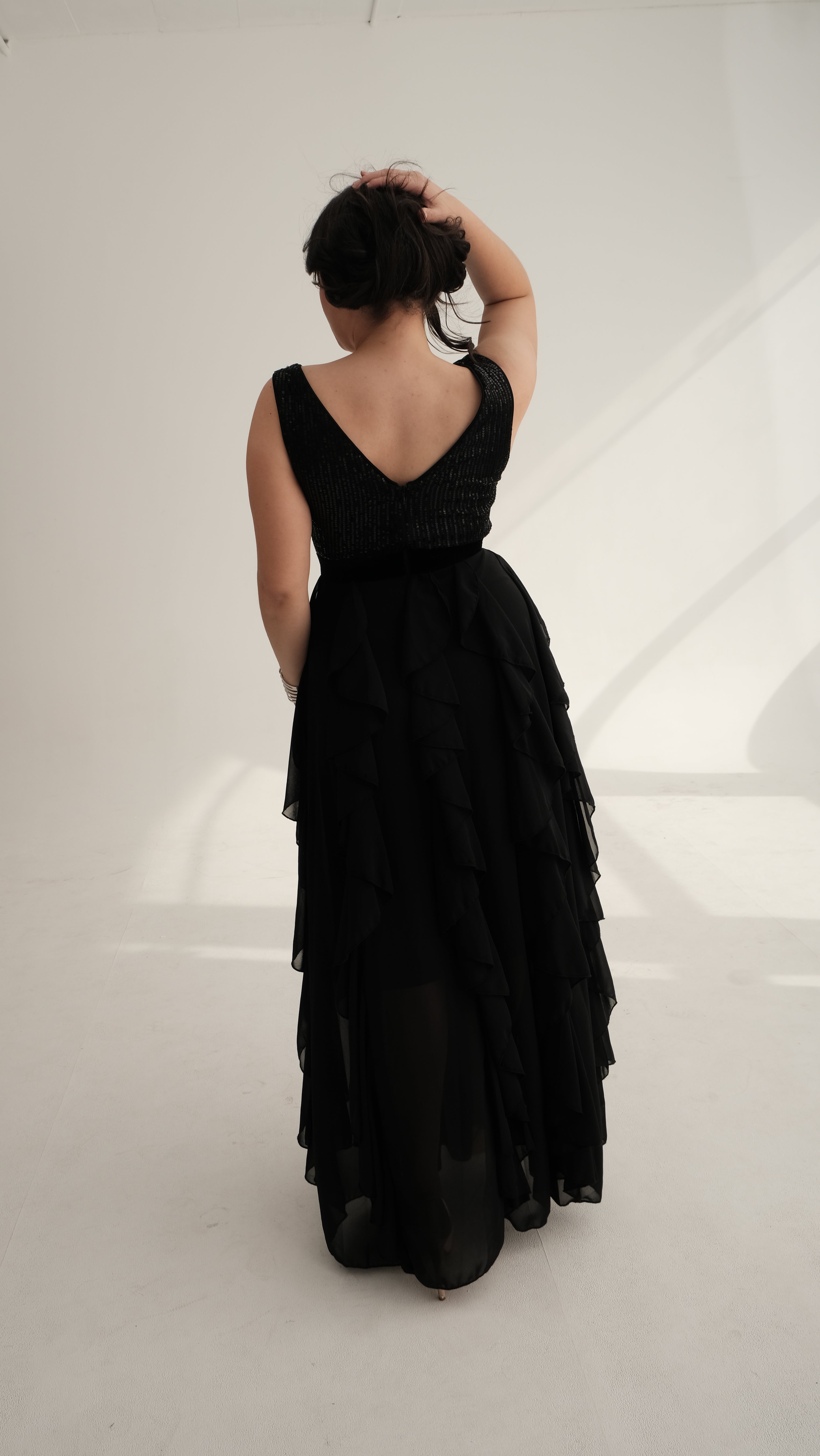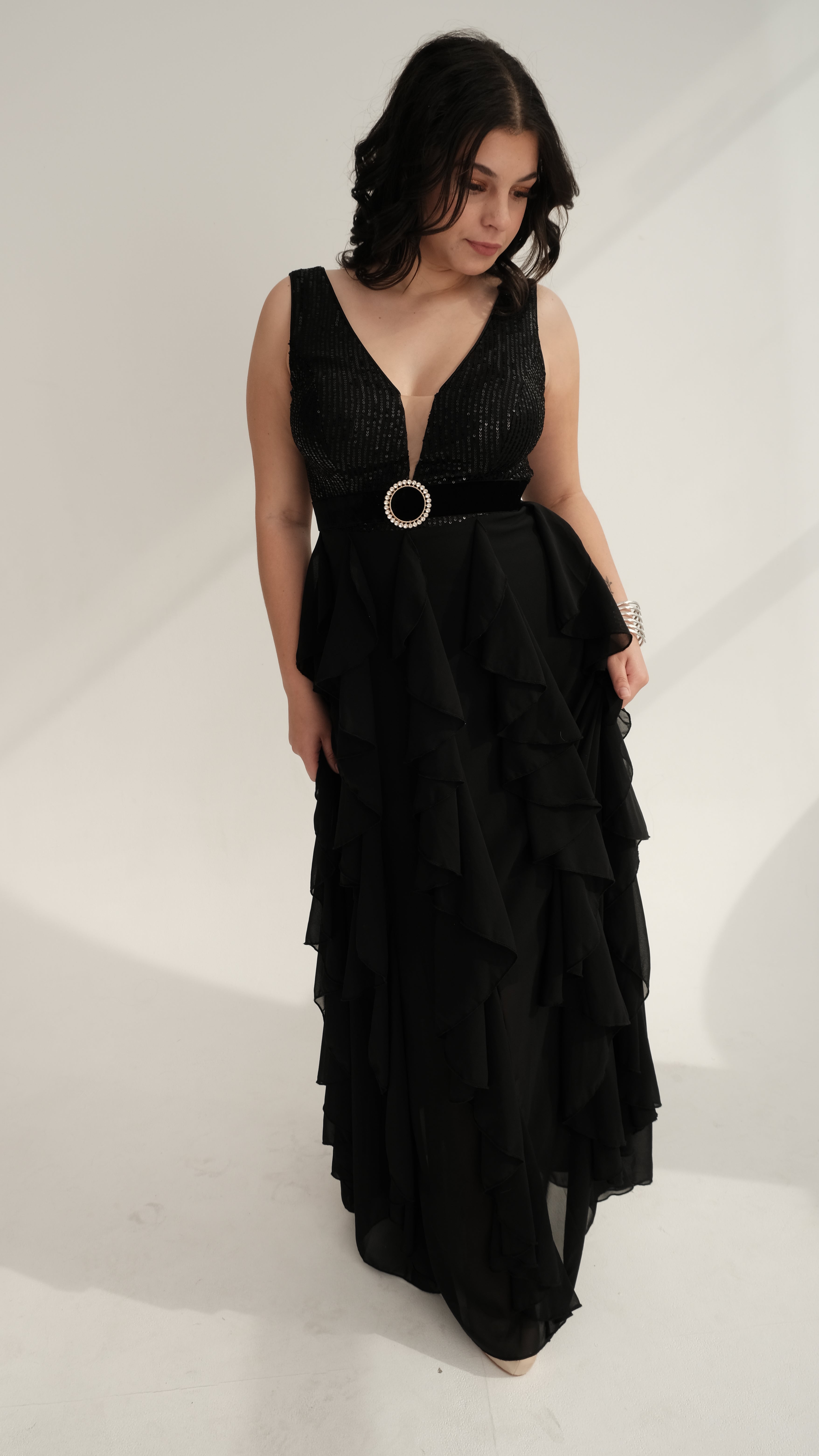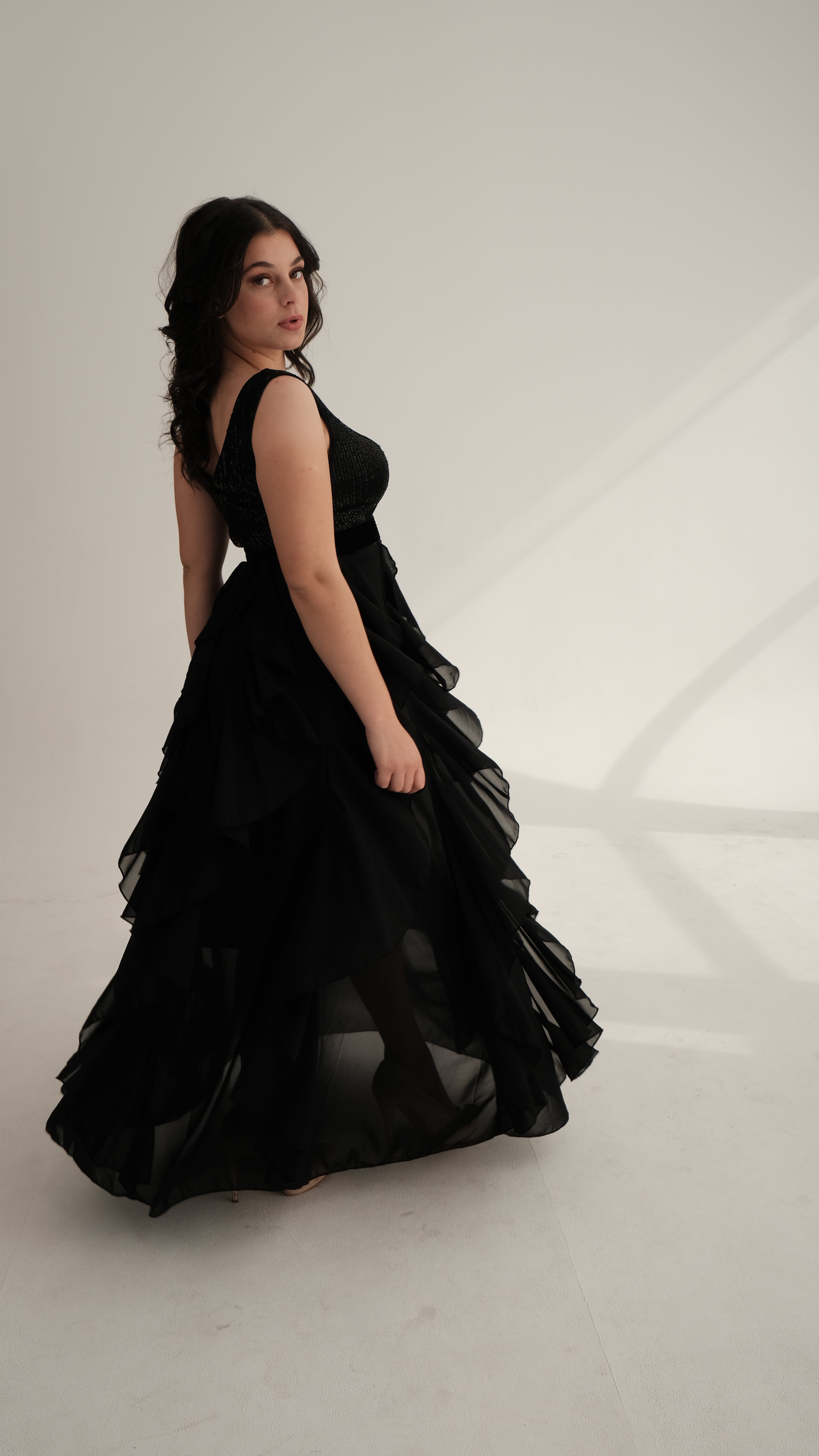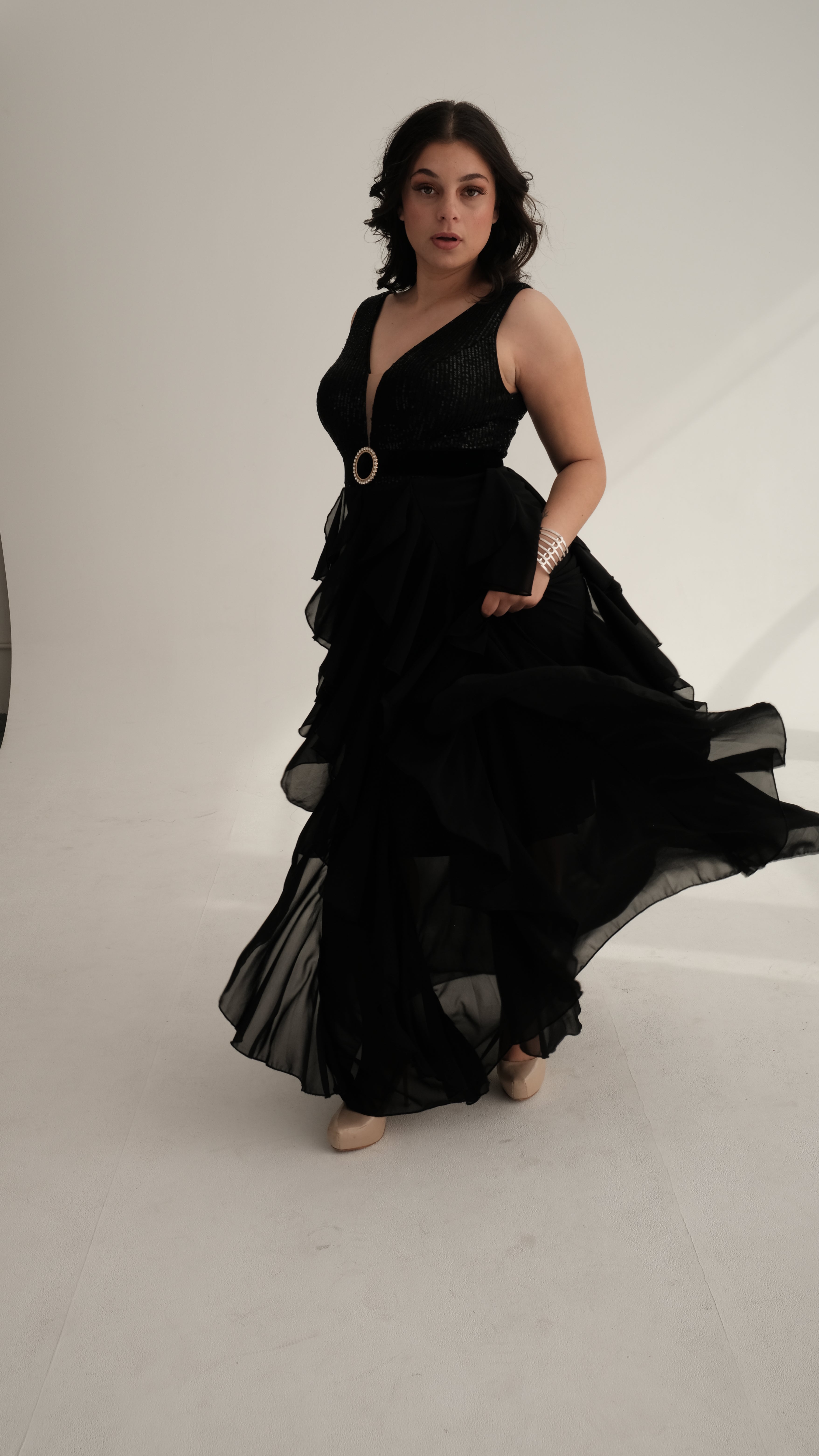Step into your own gothic-glam fantasy with The Wednesday, a striking black evening gown designed for those who dare to stand out. The deep V-neckline is adorned with a shimmering sequin bodice, perfectly balanced by a cascading layered skirt that moves with every step. A velvet waistband with a statement crystal buckle cinches the waist for an effortlessly flattering silhouette.