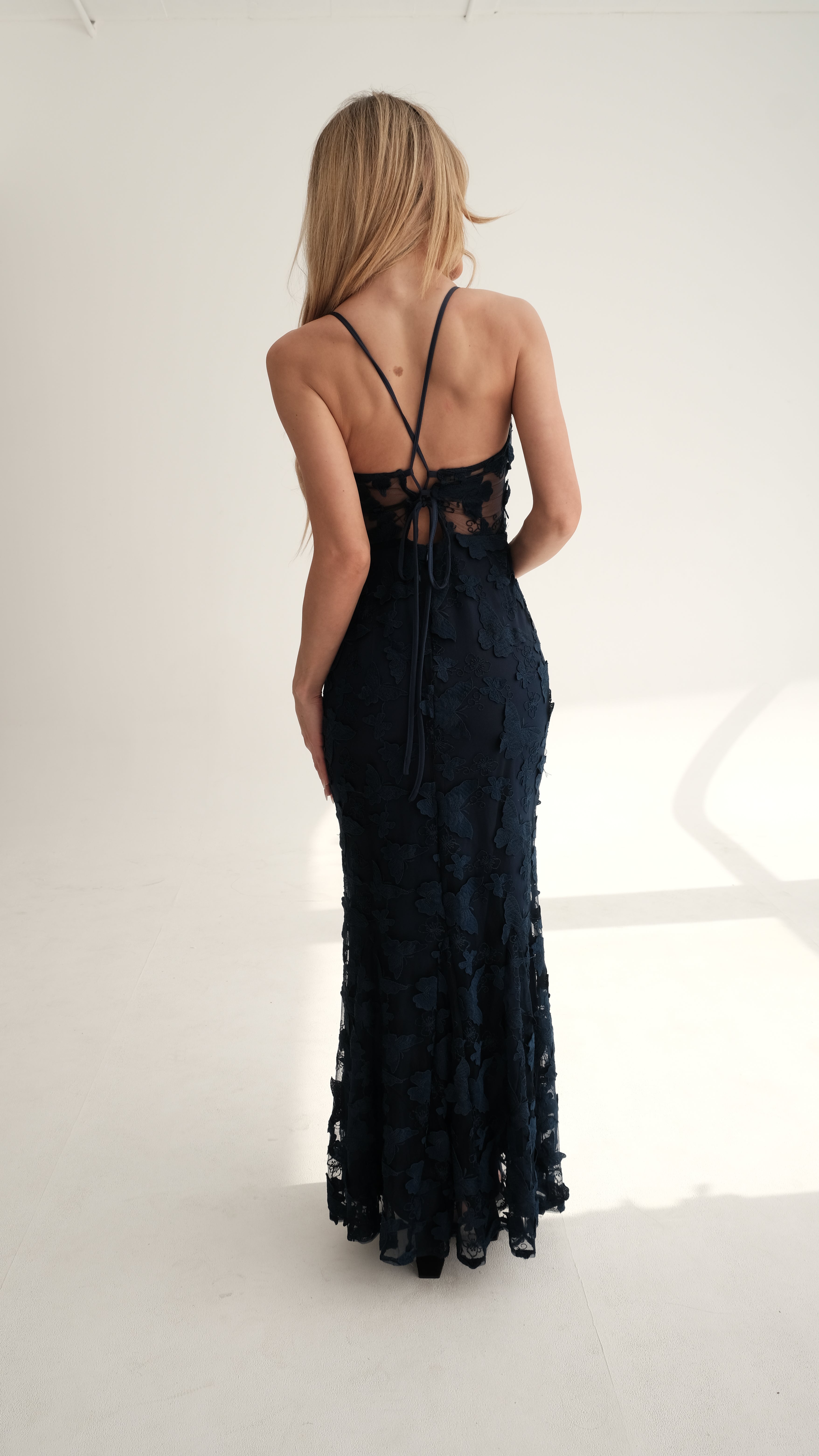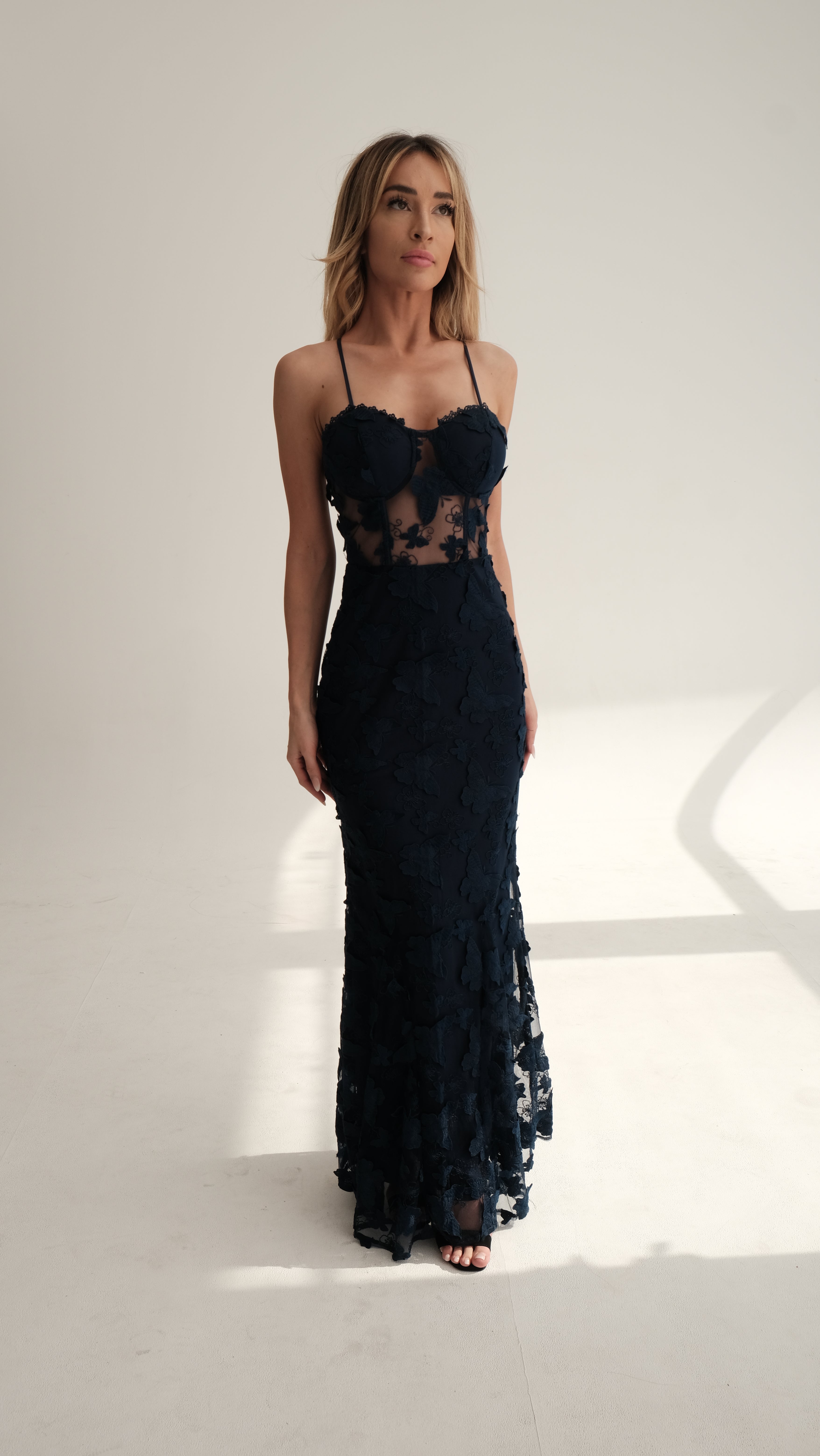 Daring yet undeniably elegant, The Zephyra is a show-stopping gown designed for those who command attention. Crafted in deep navy with intricate 3D floral embroidery, this dress is equal parts bold and romantic. The sheer mesh bodice with underwire detail creates a sculpted silhouette, balanced by the delicate lace-up back that adds a sultry finish.